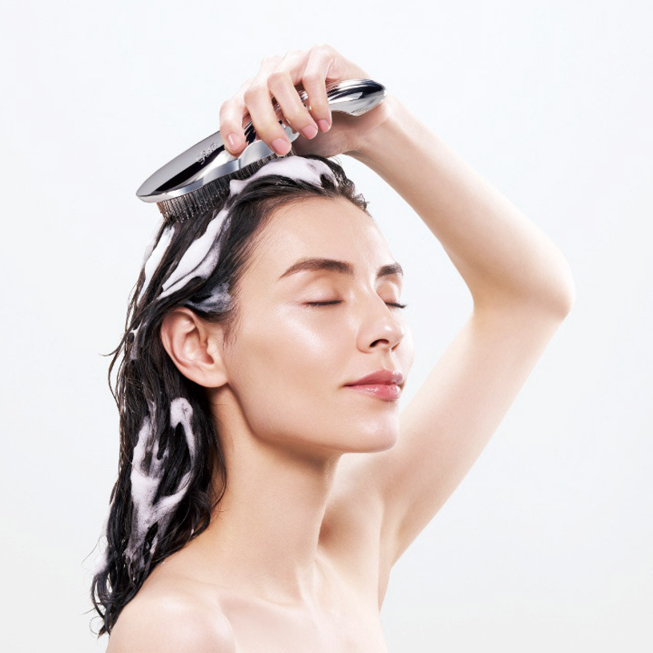 密着する、はいり込む、かき出す。頭皮の毛穴汚れのための洗浄メカニズム。1.密着するブラシが頭の形に添うようにぴたっと密着。2.はいり込む頭皮を覆い隠す髪の隙間にピンが入り込み、グイッと根元から持ち上げる。3.かき出す頭皮汚れを絡め取るようにごそっとかき出す。・頭皮にあわせた密着を叶えるラウンドボール形状頭皮へのフィット感を高めるため、中央にはピンを植毛せず、ピン全体は緩やかに傾斜するよう配置・頭皮までピンが入り込むグラデーションタッチ毛2つのかたさのピンが檀家的に触れることで、届きにくい頭皮にまで入り込みます。・汚れをかき出す 先端ボール加工・段差植毛先端ボール加工と高さの異なる2段構造の植毛が汚れを逃さずかき出します。
