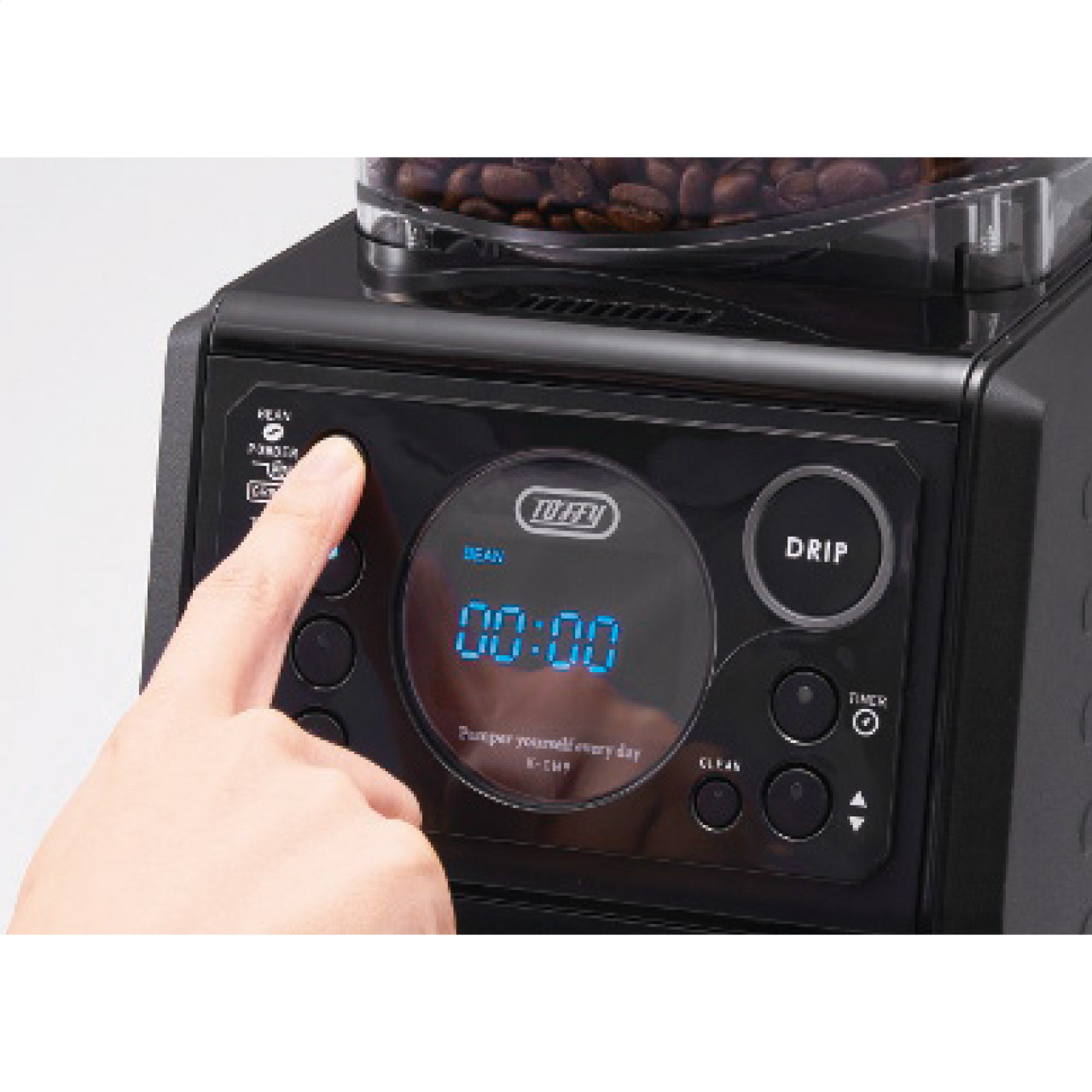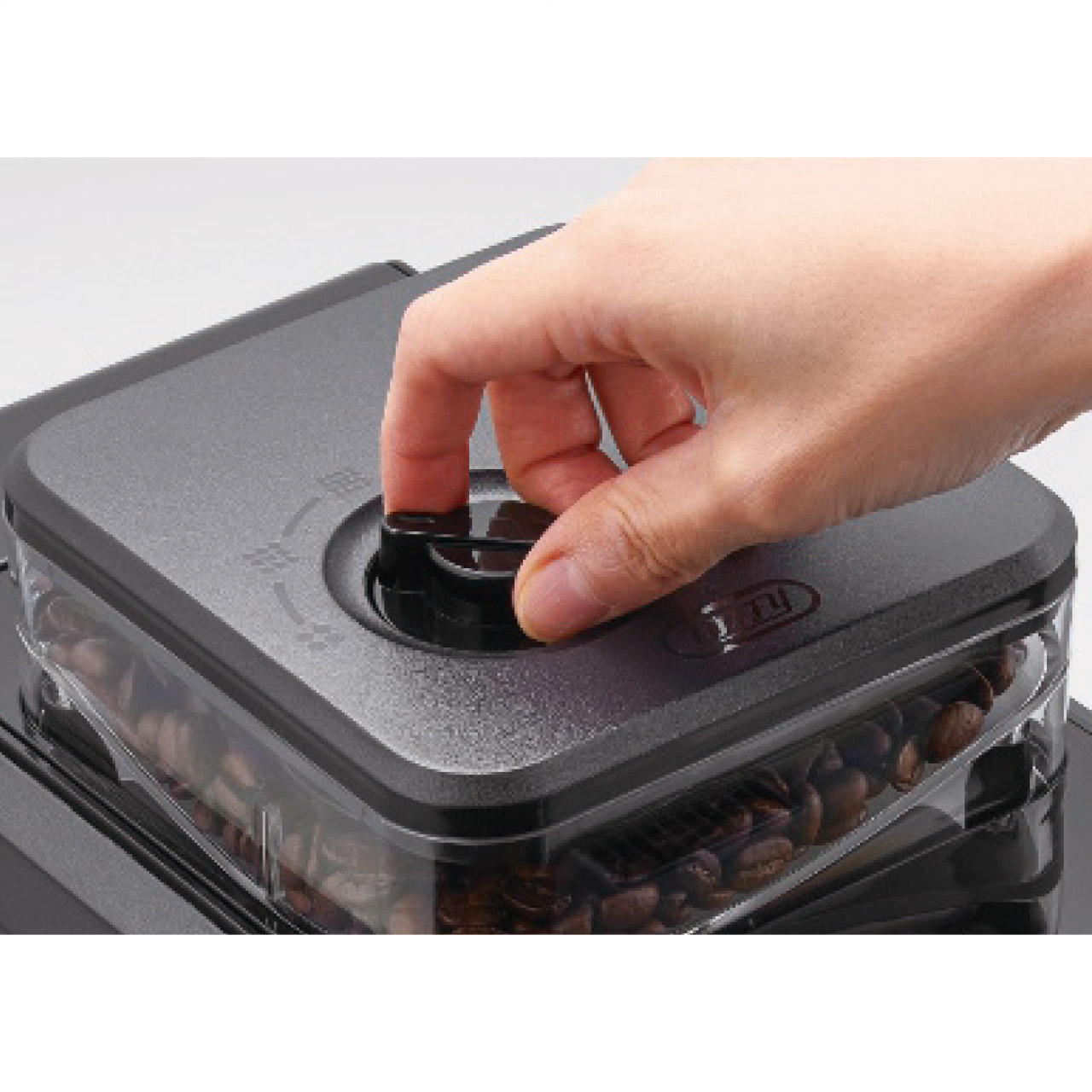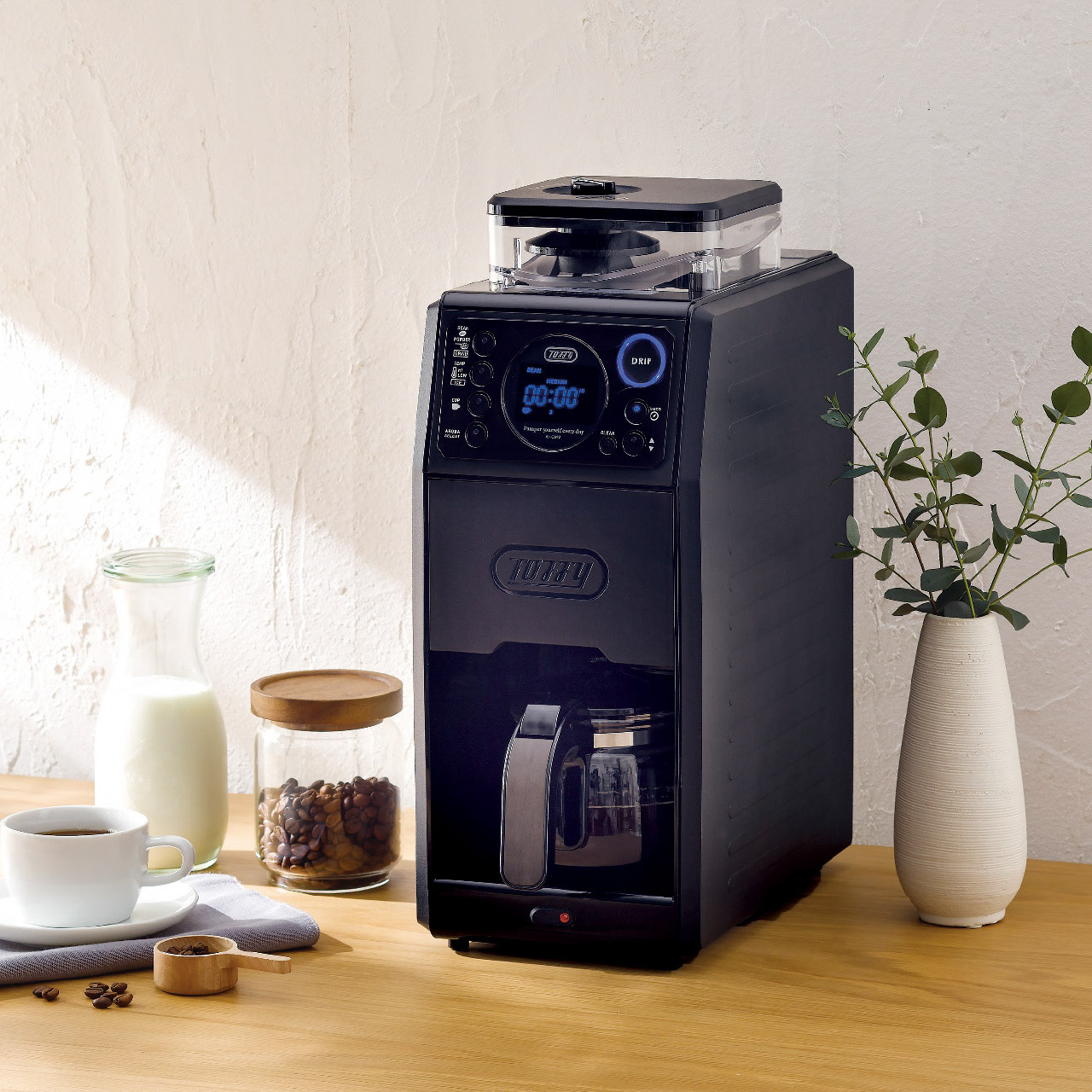 豆の挽き具合や味わいが選べるコーヒーメーカー。豆は挽き目調節ダイヤルで無段階の繊細なグラインドが可能。マイルド、ミディアム、ストロングの3段階からお好きな味わいを!コーヒーの抽出・豆挽きの完了時間を設定できるタイマー機能付きで、忙しい朝でも淹れたてのコーヒーを楽しむことができます。豆挽きからドリップまで、おまかせの全自動。一度設定を行えば前回の設定が記憶され、すぐにドリップすることも可能。