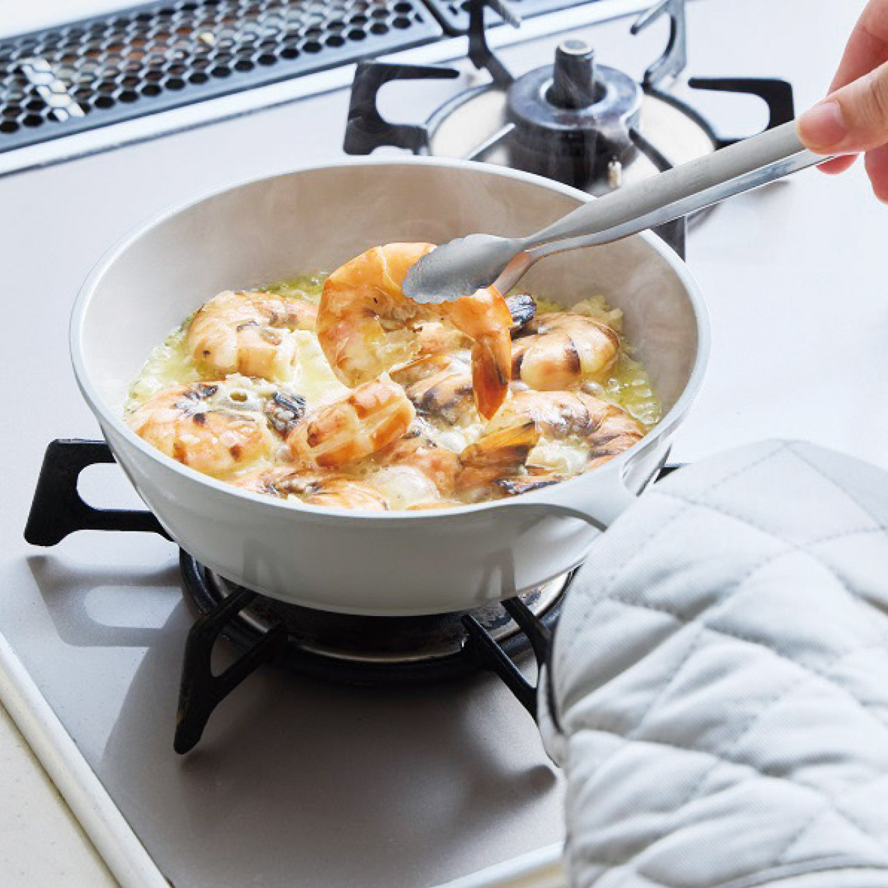 ●軽量で扱いやすい:アルミ素材を採用し、熱伝導率が高く、短時間で調理できます。女性でも扱いやすい軽さが魅力です。●汚れにくいセラミックコート:内外面に施されたセラミックコートがこびりつきを防ぎ、お手入れも簡単。忙しい毎日でも気軽に使えるのが嬉しいポイントです。●おしゃれなカラー:他にはない、グレージュの美しいカラーリングがキッチンを華やかに彩ります。●アウトドアにもキッチンにも:コンパクトなサイズ感で、キャンプなどのアウトドアにもぴったり。もちろん、毎日の家庭料理にも大活躍します。●様々な料理に!:炒め物、焼き物、煮込み料理など、様々な料理に対応。深さがあるので、グラタンも作れます。●スキレットと同じカラーの耐熱ミットでしっかりキャッチ!