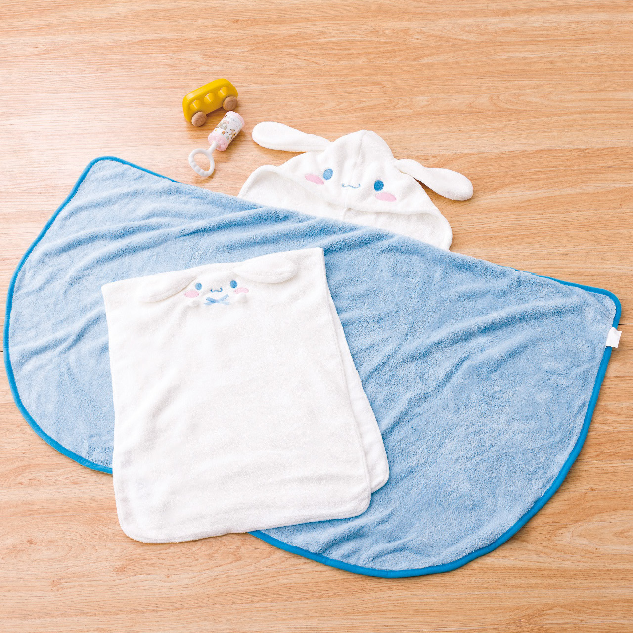 ■商品詳細 40×100cmヘアドライタオル1枚・108×60cm(フード含まず)フード付バスポンチョ1枚・ポリエステル80%・ナイロン20%・[中国製]