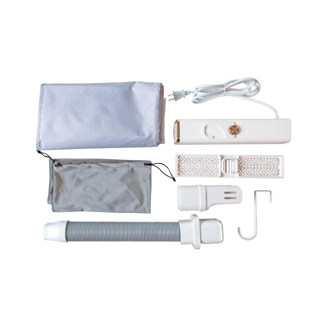 ■商品詳細 28.4×6×6.6cm・ABS樹脂、アルミニウム、PVC・消費電力:300W・コード長:約1.8m・伸縮ホース、靴用アタッチメント、折りたたみ衣類ラック、ドア用フック、衣類カバー、収納袋付・[中国製]