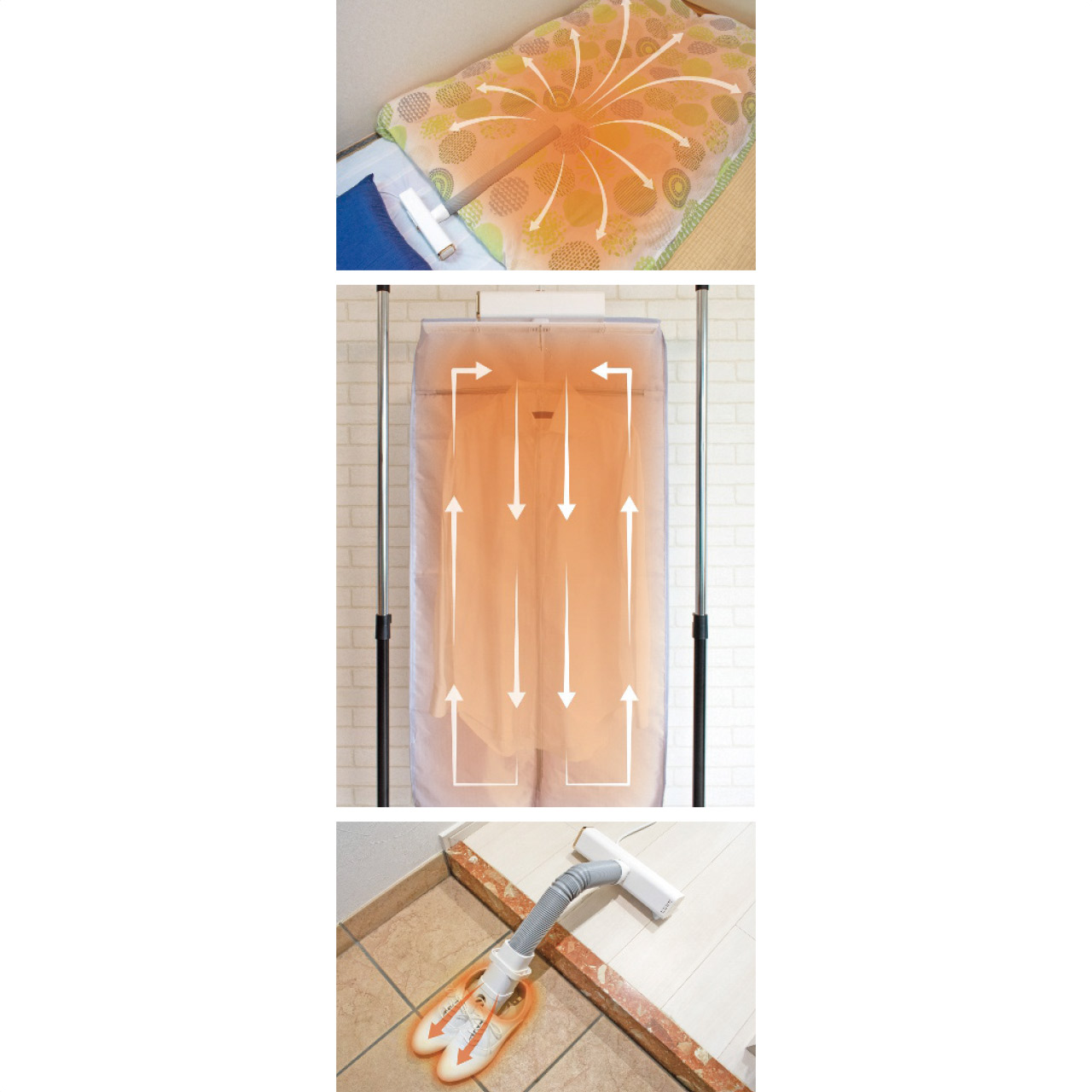 布団乾燥機・衣類乾燥機・靴乾燥機の機能が本商品1つで完結!これ1台で家中の幅広い用途にお使いいただけます。衣類から布団、靴、湿気がある場所などをサッと効果的に乾燥できるため、日々の様々なシーンでご活用いいただけます。