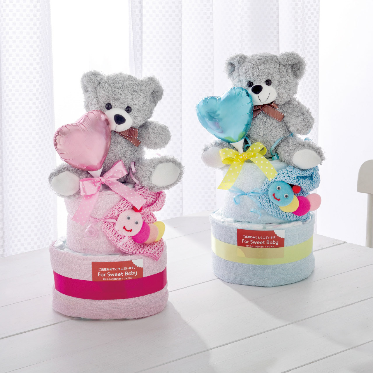 紙おむつを丸めて、リボンやバルーンなどで可愛く飾りつけをし、デコレーションケーキに見たててプレゼント。可愛くて開けてびっくり、感動を呼ぶサプライズ。HAPPY BABYのカード付き。