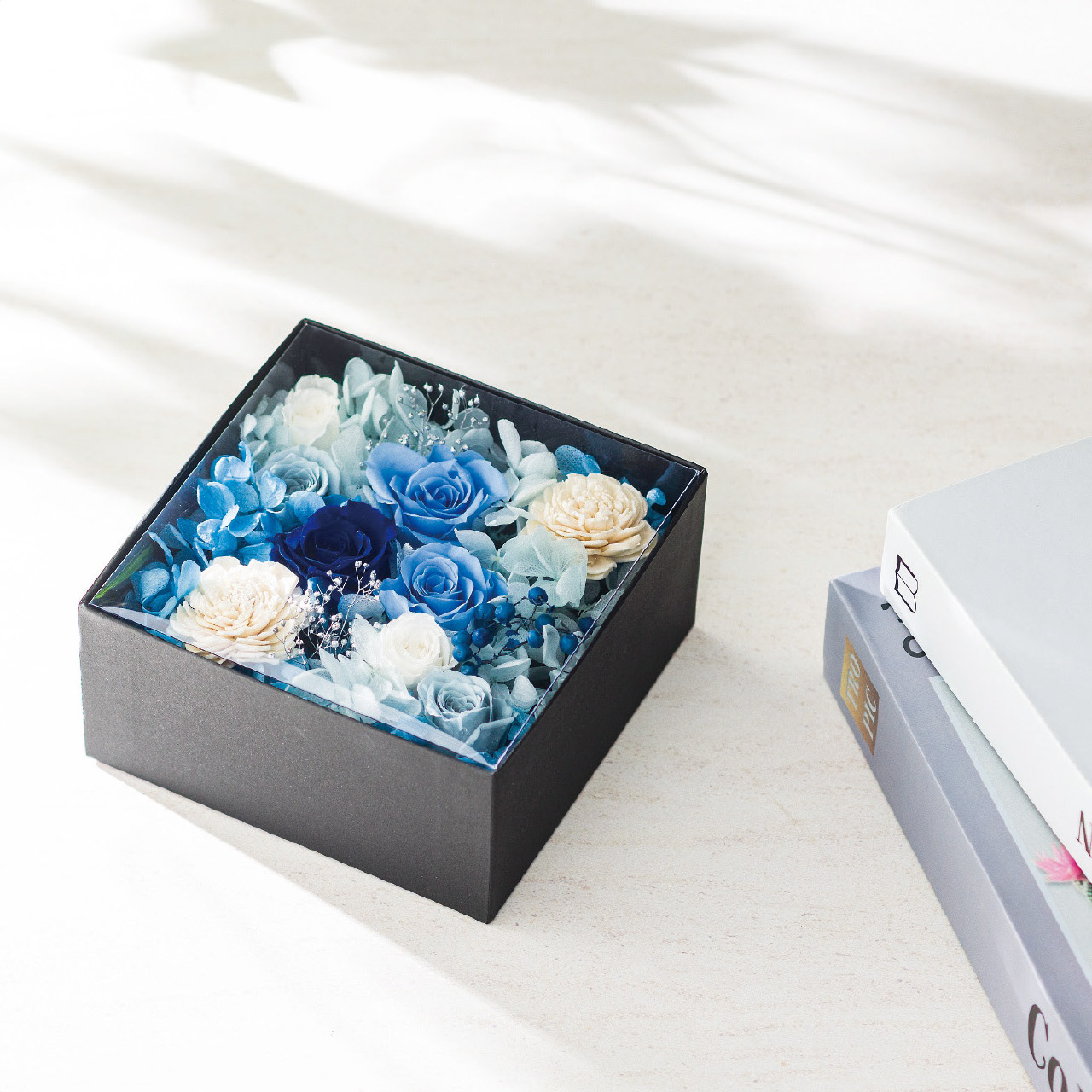 高級感のある紙製ボックスの中は枯れないお花の庭園。生花を特殊な溶液につけ保存加工したプリザーブドフラワーは洗練された繊細さと美しさを表現してくれます。クリアな蓋付き。