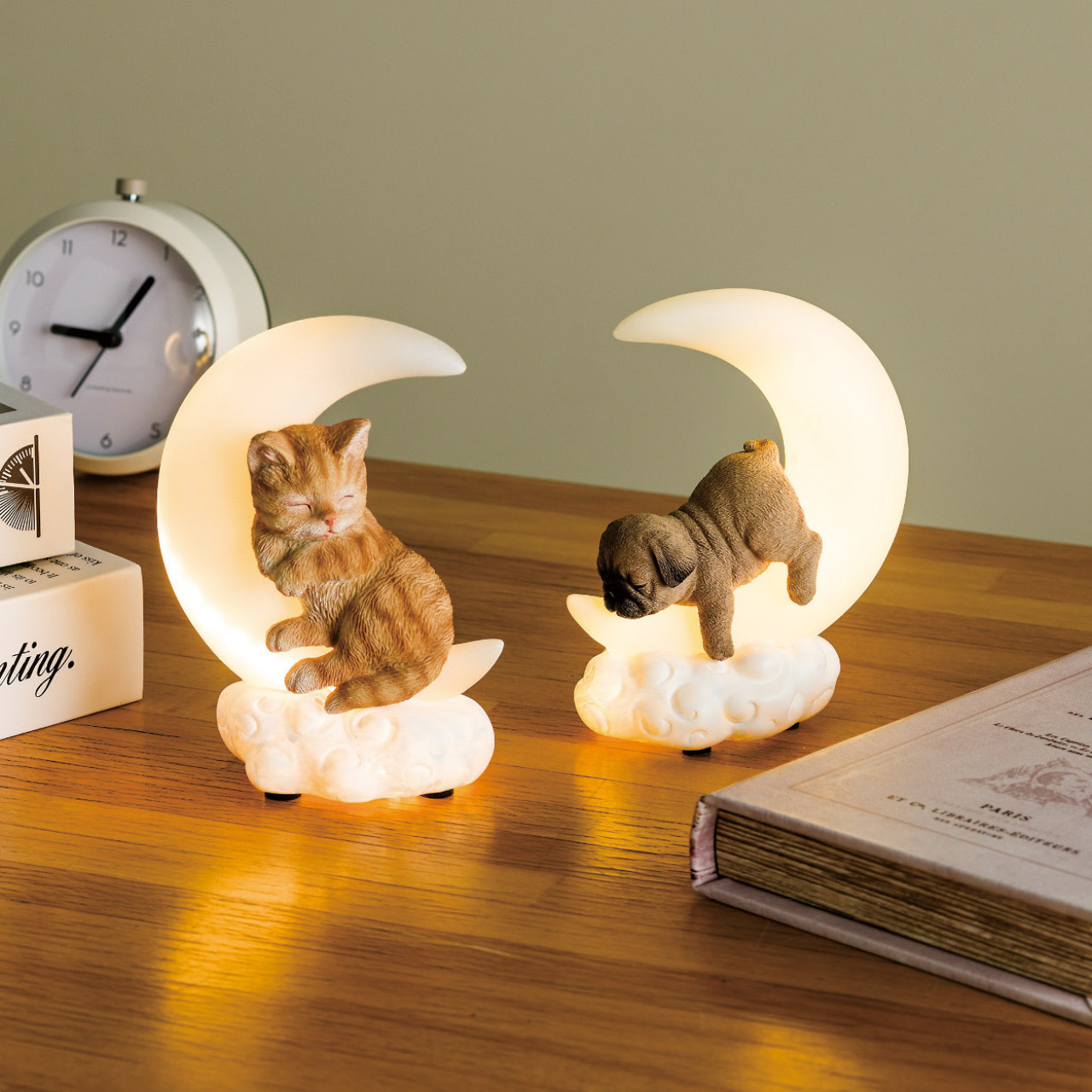 ムーンにほんのり灯るあかりと、もたれてスヤスヤ気持ちよさそうな子たちに癒されます。(底面にON/OFFスイッチ)