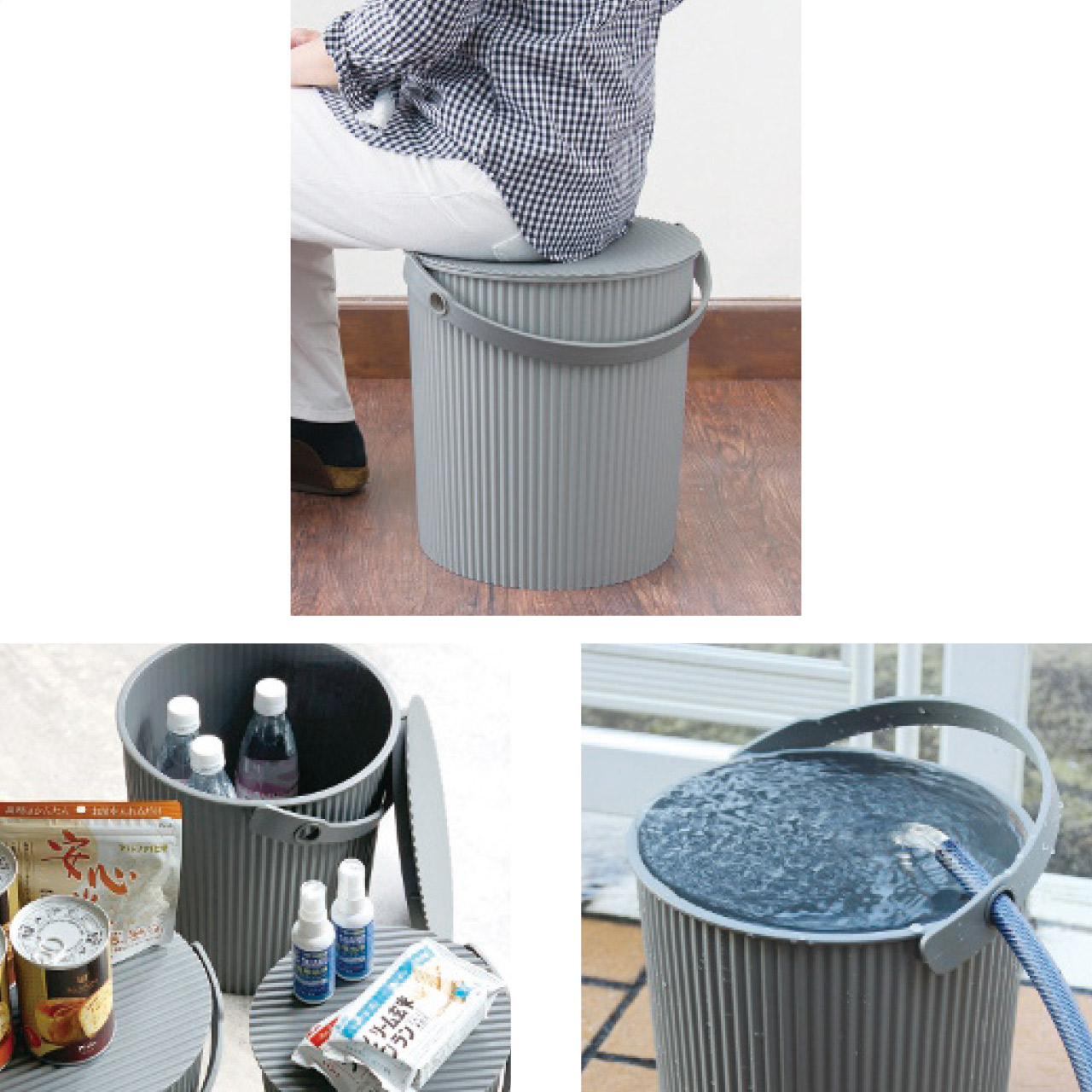 ダンボールのように波うつデザインの座ることのできるフタ付きバケット。Lサイズ(10L) 2個セット。キッズルームのおもちゃ入れや食材の収納BOXなど小物収納、防災グッズ入れとして幅広く使えます。フタに腰かけて簡易スツールやサイドテーブルとしても使えます(耐荷重約150kg)。ハンドルにはホースを通せる穴があり、水圧ではずれない工夫がありますので、洗車やガーデニングの水汲みバケツとして。日本製。