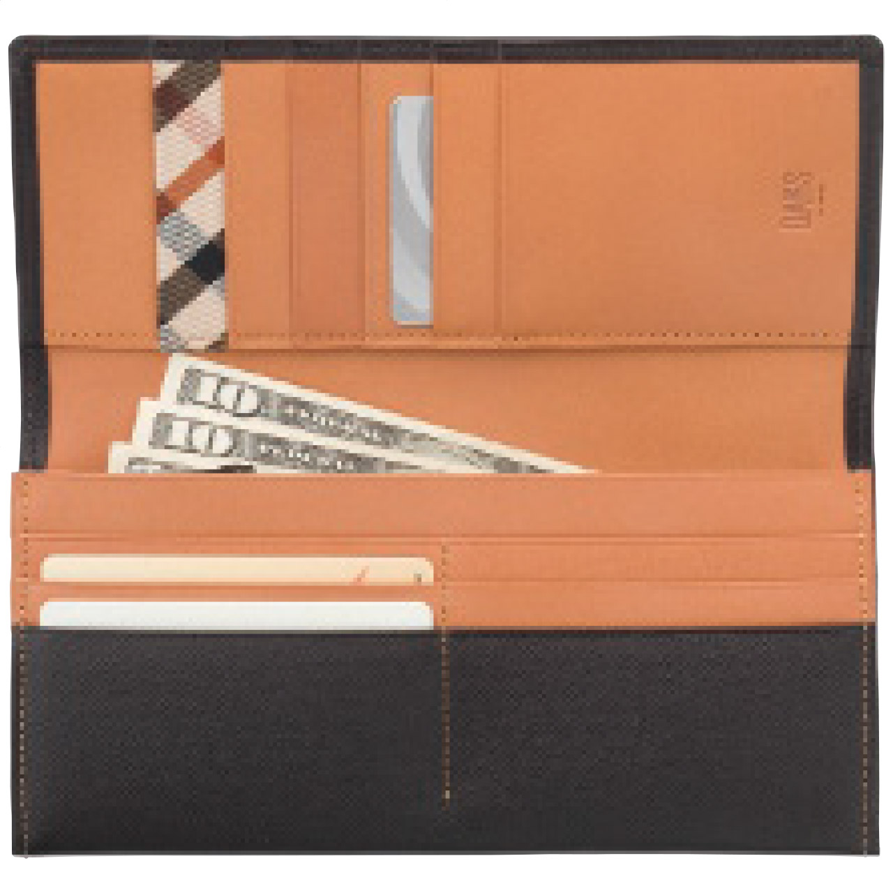 美しく輝く上品な光沢を放つエンボス革を使用。表のDDのロゴ、内側のハウスチェックのカード段がアクセントになっています。