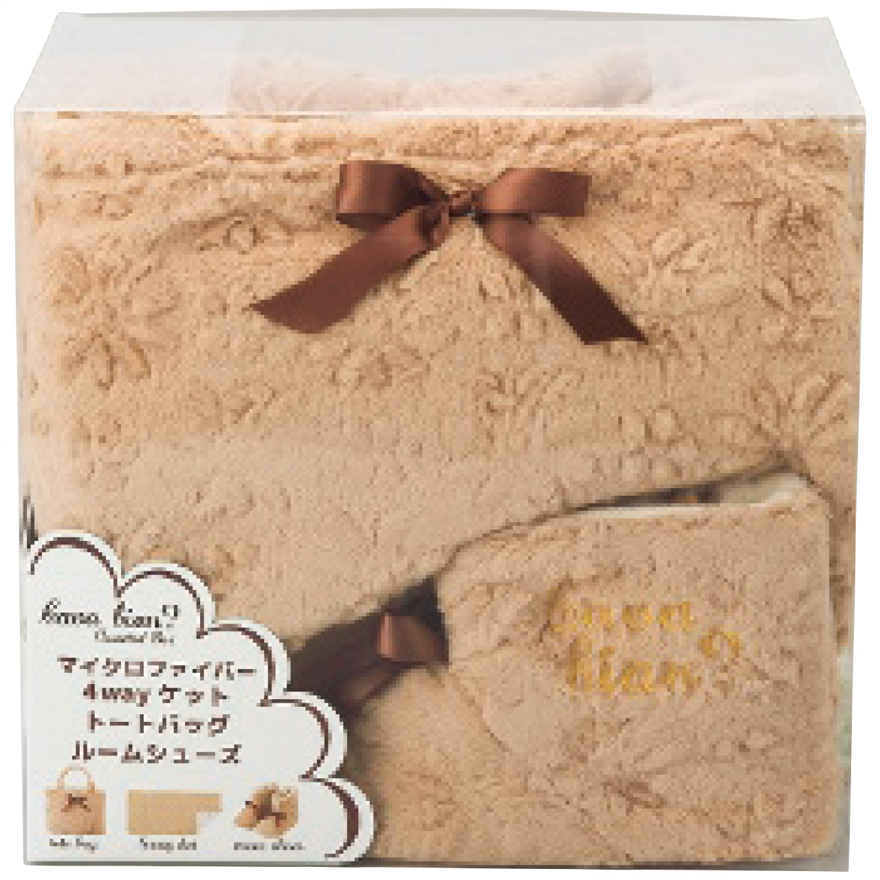 ■商品詳細 フリーサイズルームシューズ1足・30×26×9cmトートバッグ1個・70×140cm4ウェイケット1枚・ポリエステル100%・[中国製]