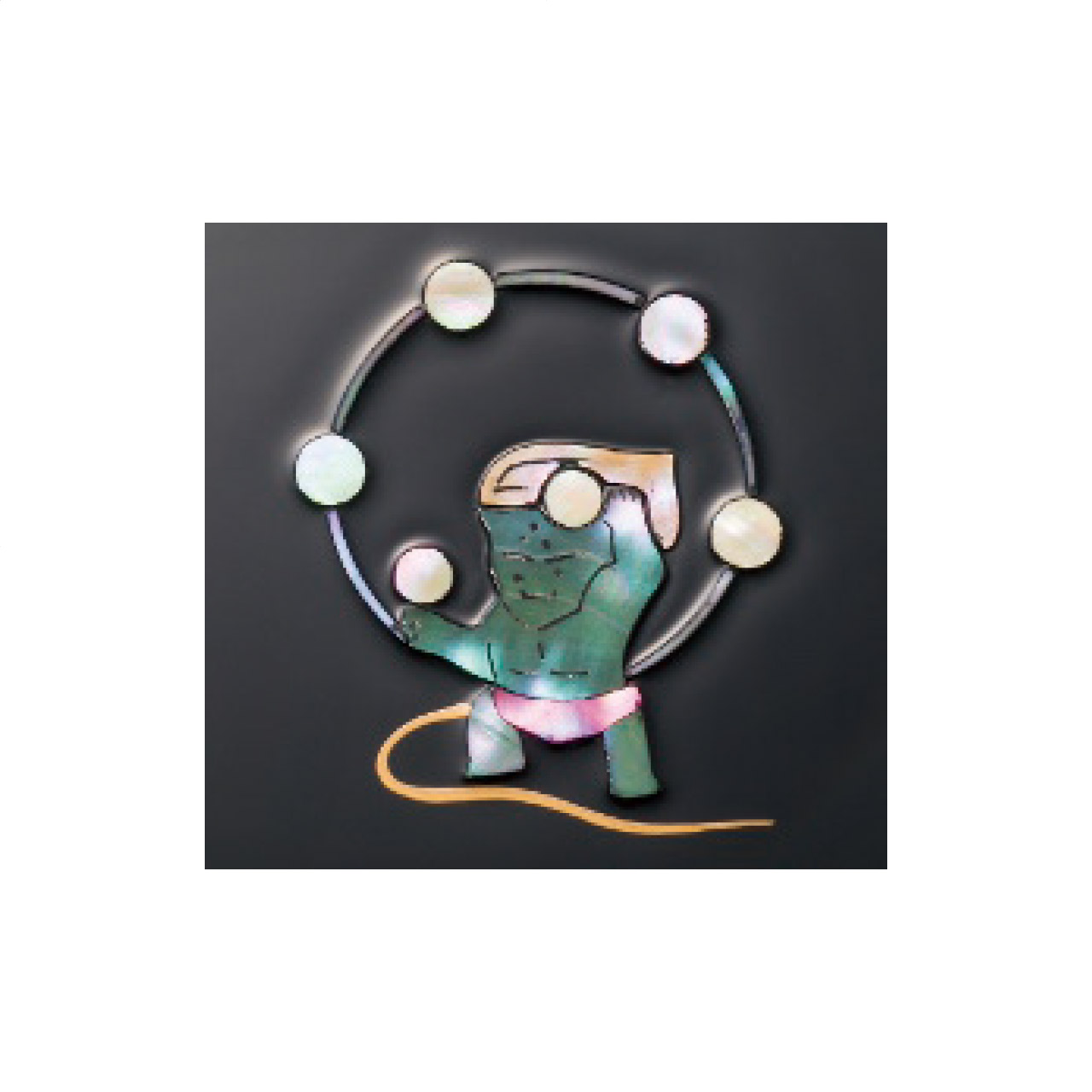 かわいらしい雷神さまを螺鈿で表現した丸盆。