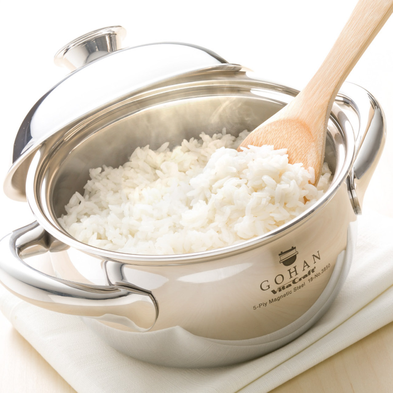 ■商品詳細 最大内径17.5cm高さ15.6cm(蓋含む)ごはん鍋1個・本体、蓋:18-8ステンレス、電磁性ステンレス、アルミニウム、アルミニウム合金(全面5層構造)・ツマミ、ハンドル:ステンレス・レシピブック付・[ベトナム製]