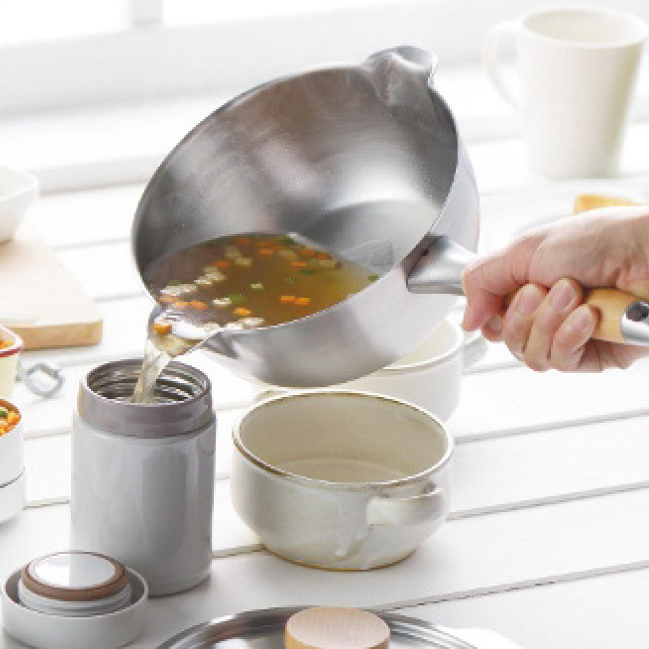 丈夫でお手入れの楽なステンレス製の雪平鍋に、特徴的な口形状を付けました。移し替えでこぼれたり、垂れたりしないので、キレイに注ぐことができます。汁物・煮物の移し替えに便利です。本体は煮汁がまんべんなく対流し、美味しさが引き出せるよう、ほどよい丸さを持った形状です。取っ手は握りやすいカーブに設計。手になじみやすく、優しい温もりの木製。フタは鍋のラインに添わせた形状です。スライドさせて、注ぎ口を開けることで蒸気を逃し、吹きこぼれを防止します。ツマミは手になじみやすく、優しい温もりの木製です。