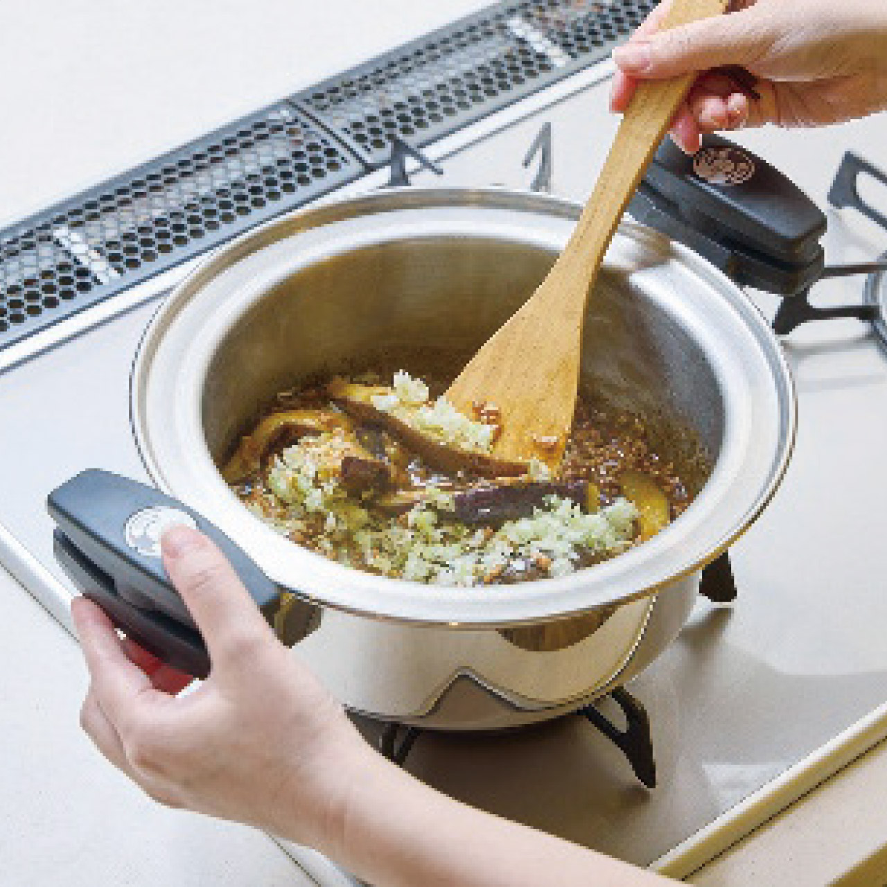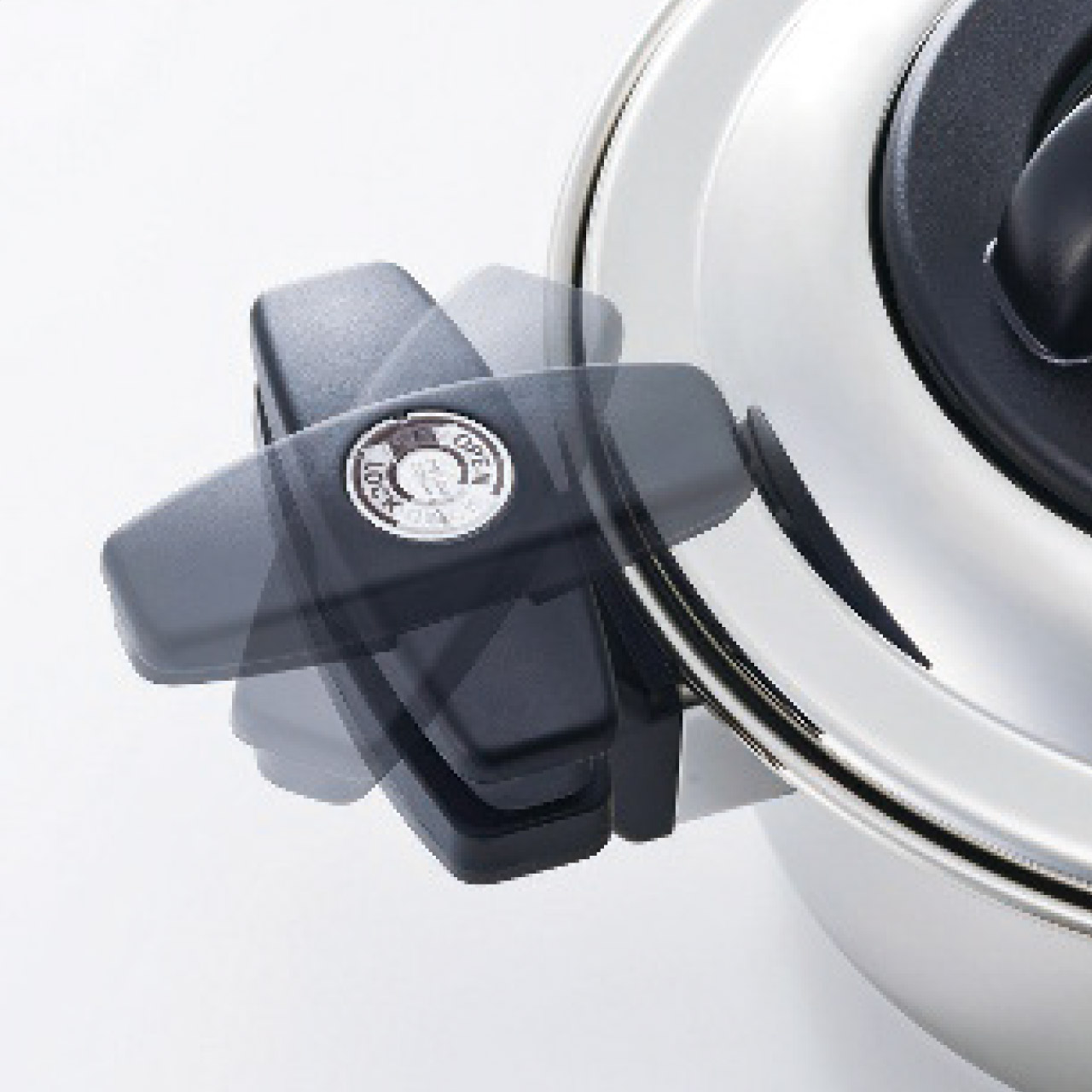 ハンドルについているロックをかけることにより、低い圧力がかかり、普通のお鍋と比較すると調理時間は約2/3に短縮。ロックをかけなければ、普通のお鍋としても使用できます。