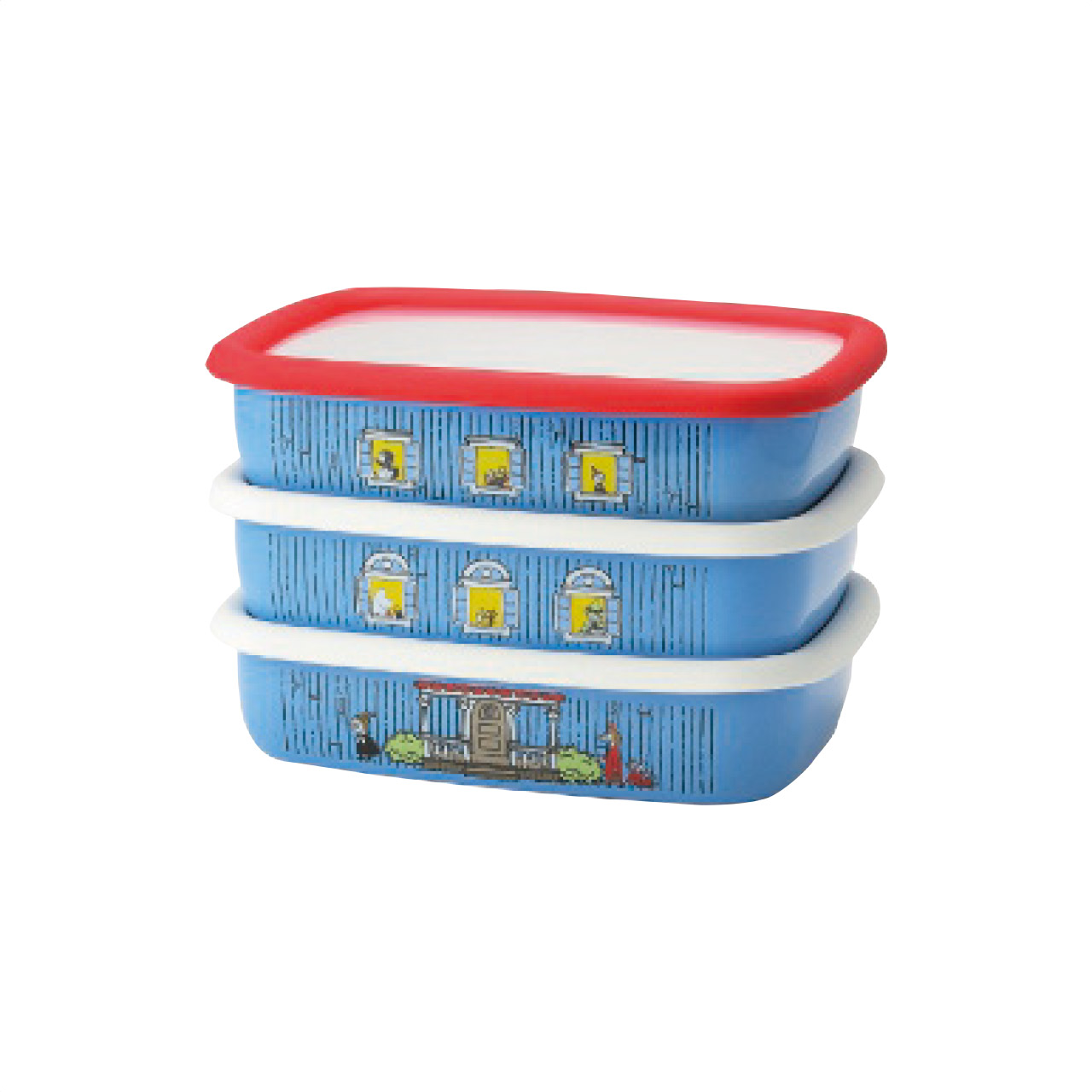 ■商品詳細 19.5×14×4.5cm容量0.9l角型容器(M)3個・ほうろう用鋼板・蓋:ポリプロピレン樹脂(縁:熱可塑性エラストマー)・[タイ製]