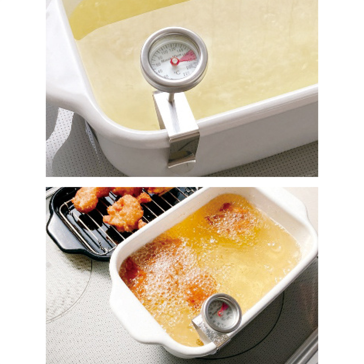 コンパクトな形状にバットや温度計付きで、お弁当作りにとても便利です。     本体の内面が白いので、衣の色や油の汚れ具合もわかり易く、バットが付いているので更に使いやすくなりました。都市ガスをはじめ、200ボルトの電磁調理器に御使用頂けます。