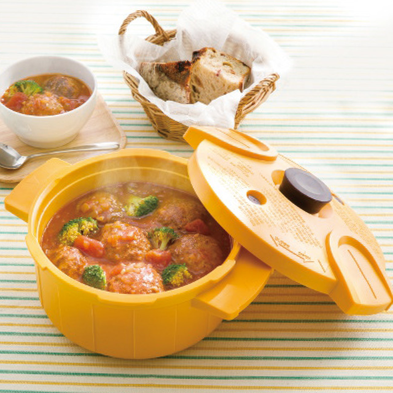 電子レンジで美味しく圧力調理。材料を入れて電子レンジで加熱するだけ。圧力調理で加熱時間が短縮。軽量でお手入れ簡単なプラスチック製。ごはん・惣菜30レシピ付き。