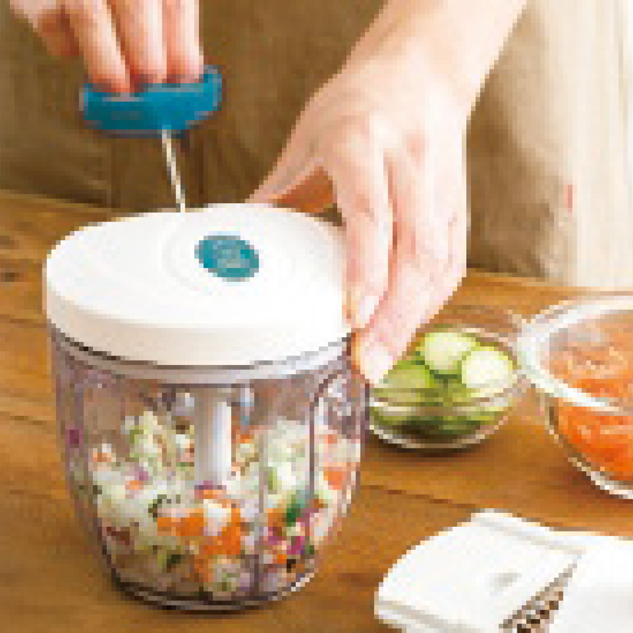 ハンドルを引くだけで、簡単にみじん切りができる便利グッズ。5枚刃なので、パワフルかつスピーディー。ハンドルを引く回数によって、仕上がりを微調整できる。また付属のパーツを使えば【薄切り】【薄千切り】【千切り】【つま切り】【おろし】もできてマルチに活躍!!
