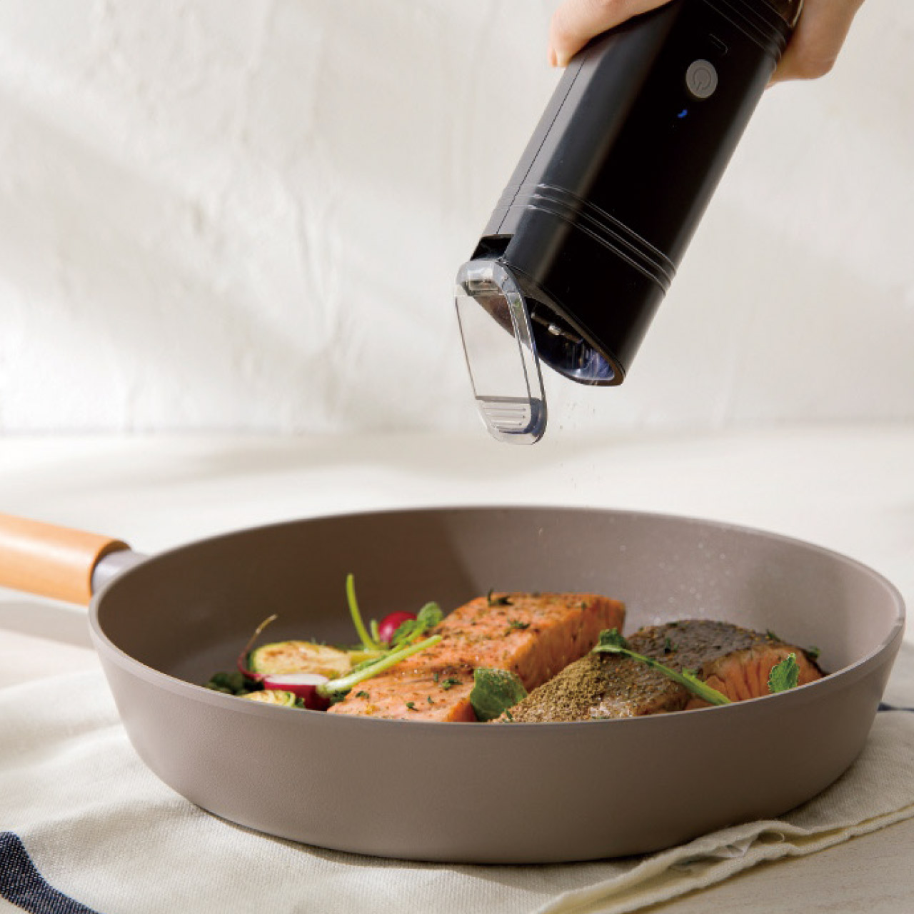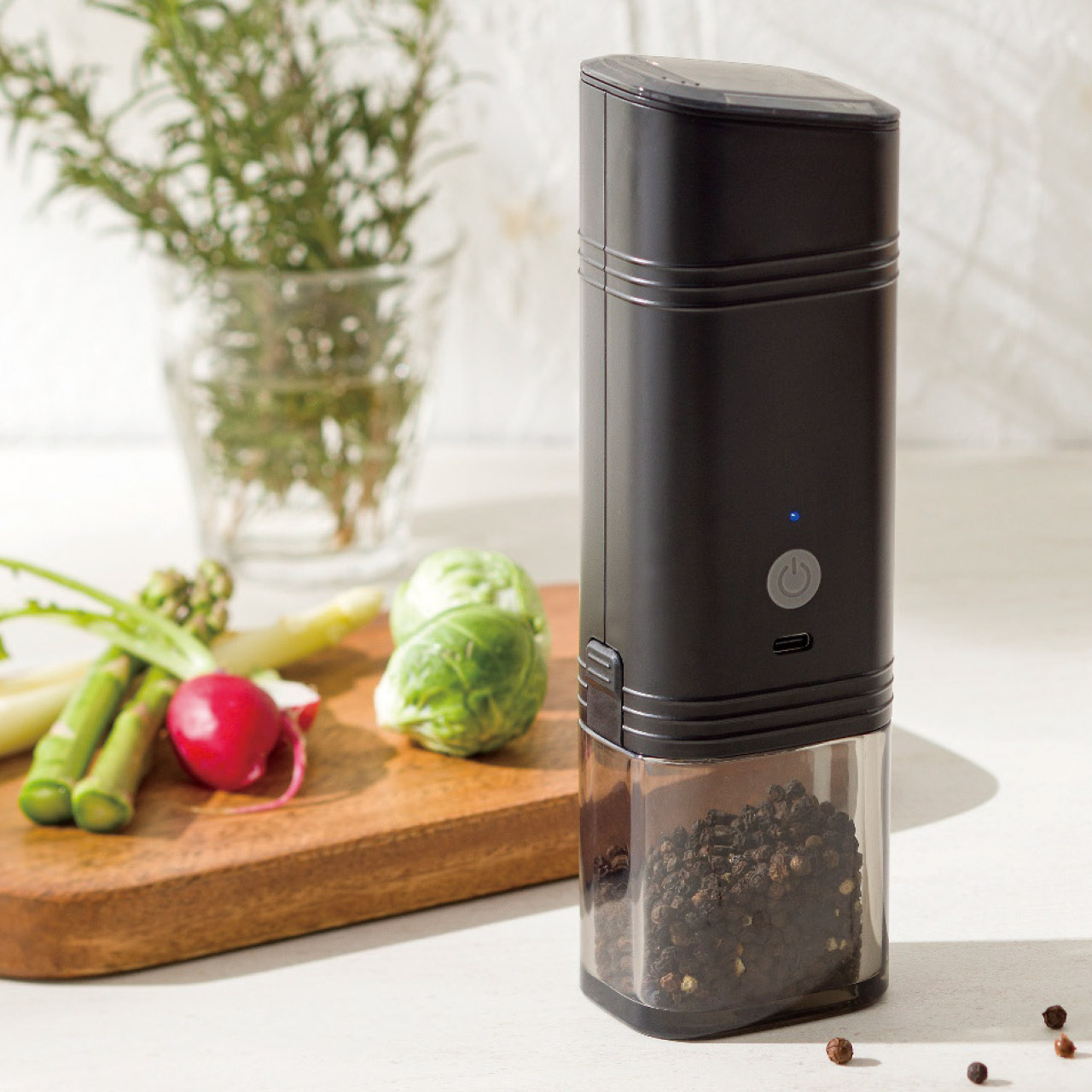 捜査は傾けるだけ。誰でも簡単にソルトやペーパーを挽くことができる。調味料コンテナ100ml。粗々調整もできます。LEDライト付き