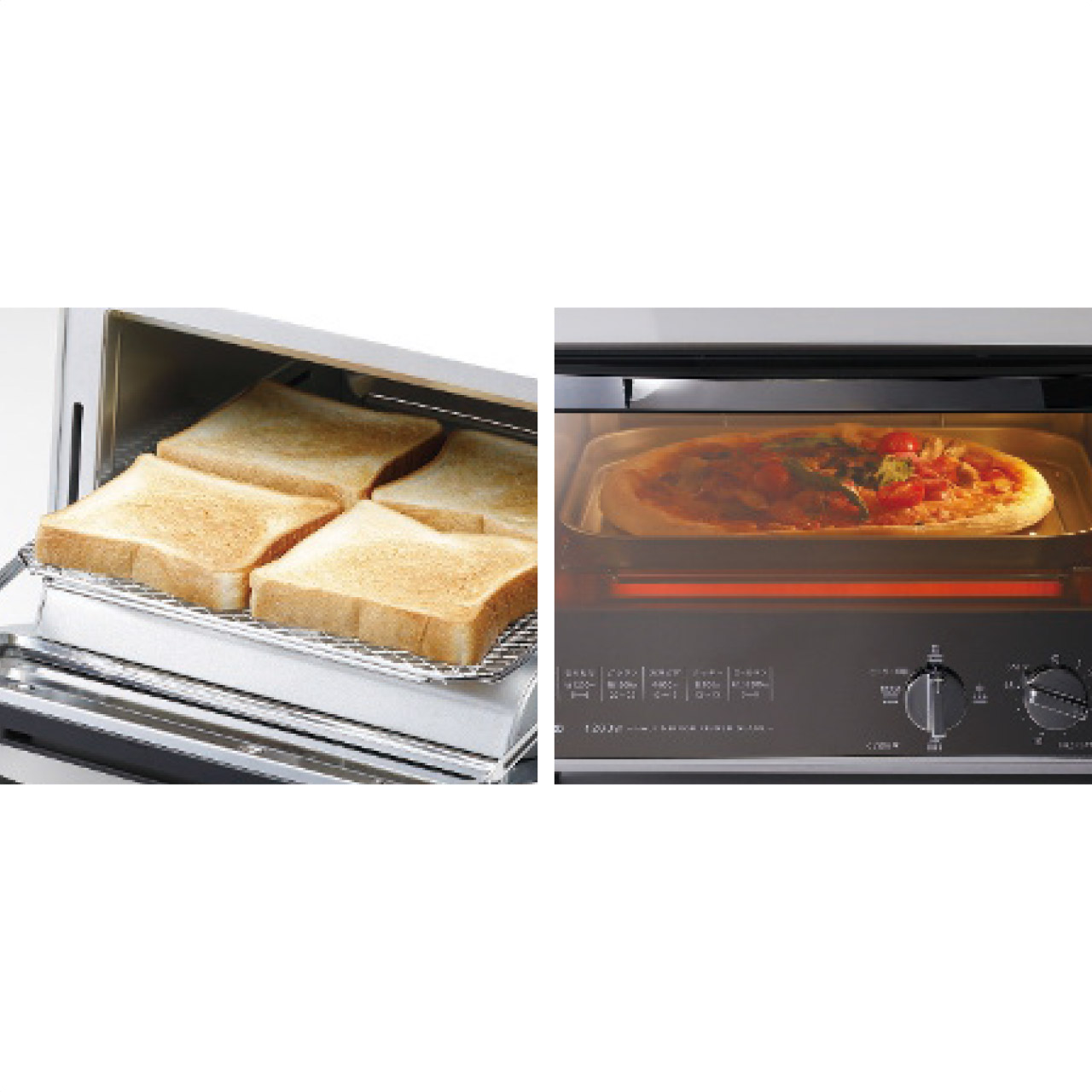 スタイリッシュなミラーガラスデザイン。ミラーガラスで熱を逃さず焼きムラを軽減。 網が大きくせり出して食品の取出しがラクラク。 用途に合わせて使える出力切替4段階。