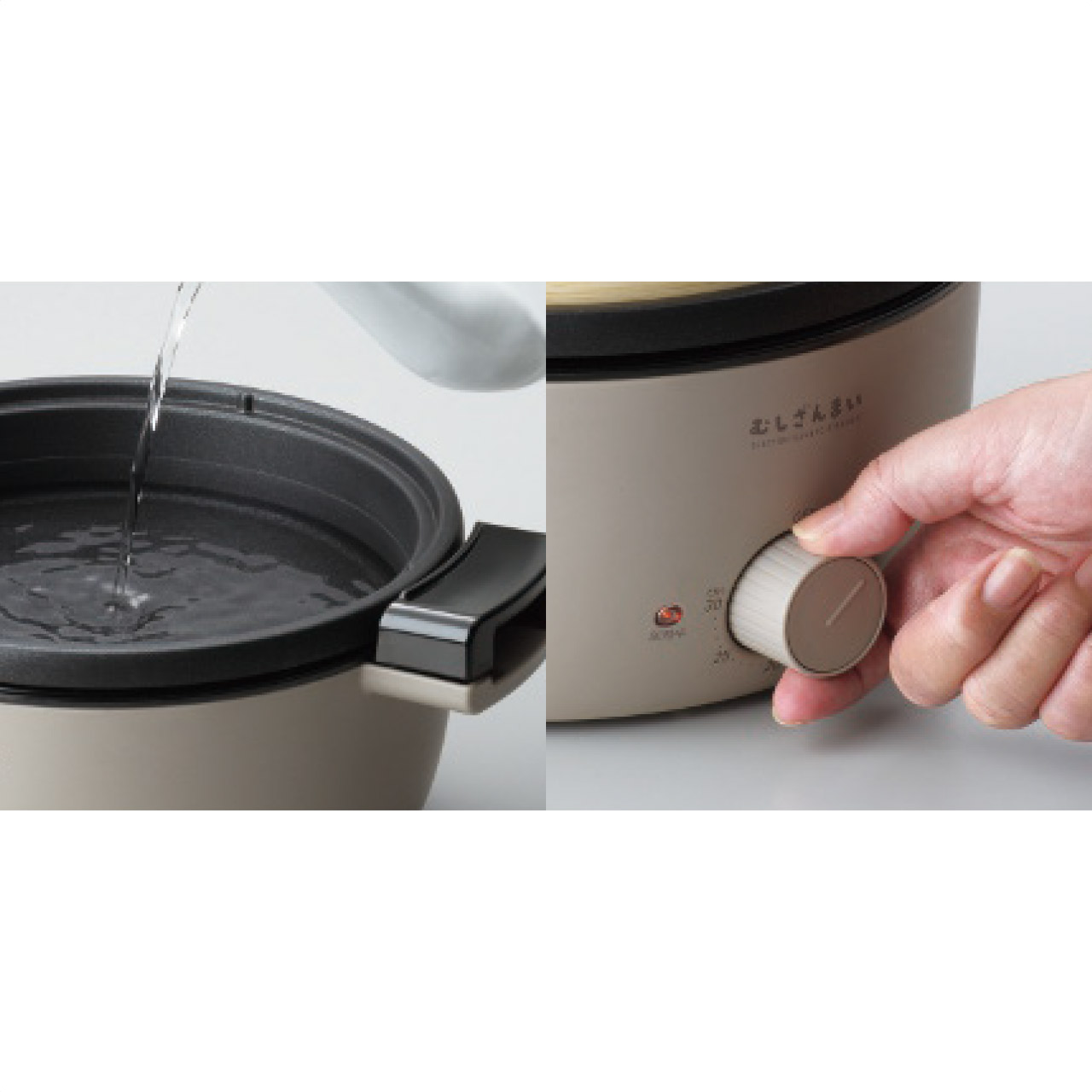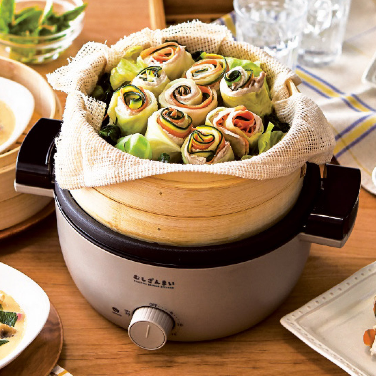 ■商品詳細 29×23.7×28cm・本体:ポリカーボネート、ポリプロピレン、アルミメッキ鋼板、アルミダイキャスト・蒸し鍋:アルミダイキャスト、フェノール樹脂・せいろ:竹・消費電力:800W・コード長:約1.4m・せいろ2個・蒸し鍋、蓋、レシピブック付・[中国製]