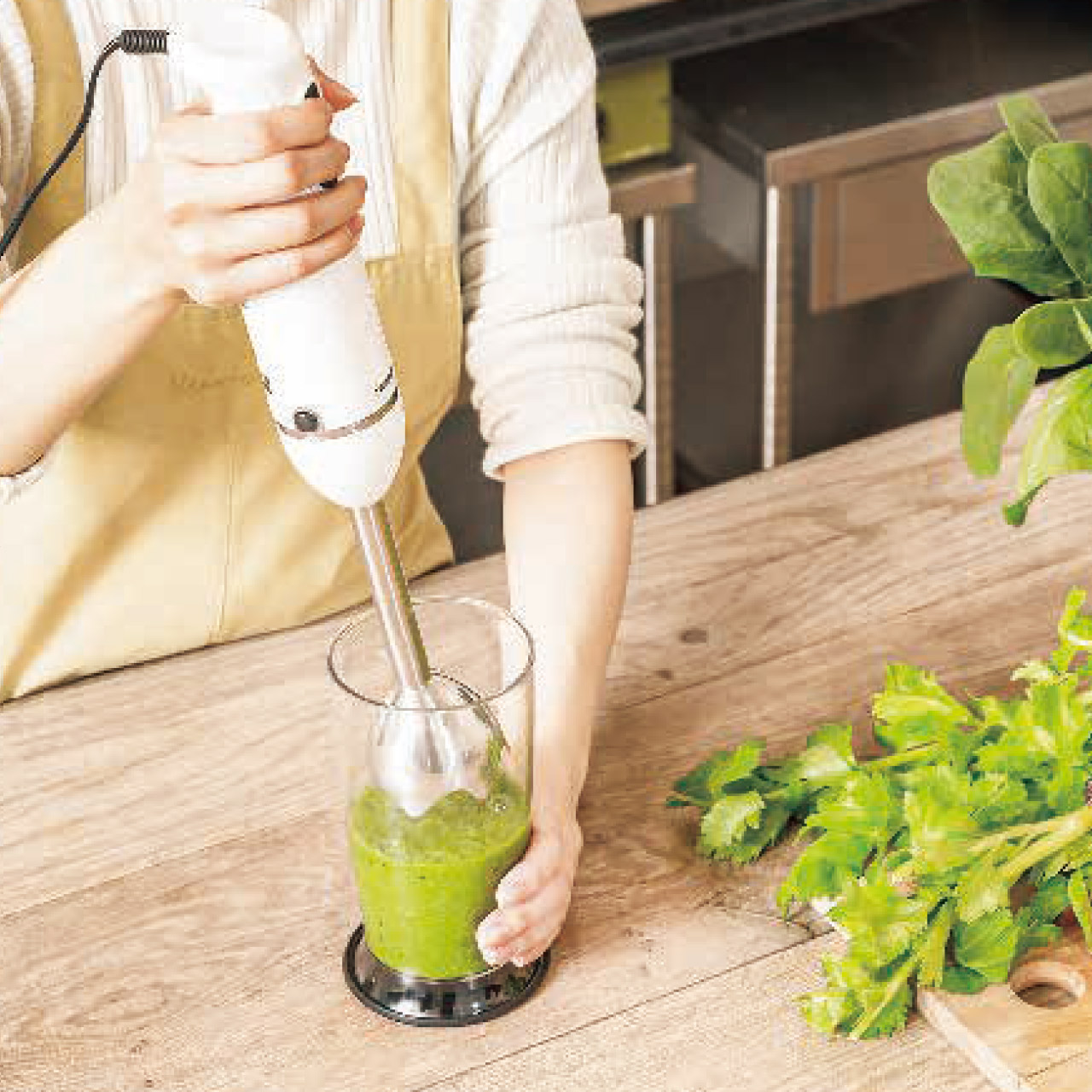 赤ちゃんの離乳食やジュース作りが簡単に。 つぶす、練る、混ぜるの一台三役。 食材の臭いや色が移りにくいステンレス製ブレンダー。 用途に合わせたスピード2段階切替。 ドレッシング作りに便利な目盛り付専用計量カップ。