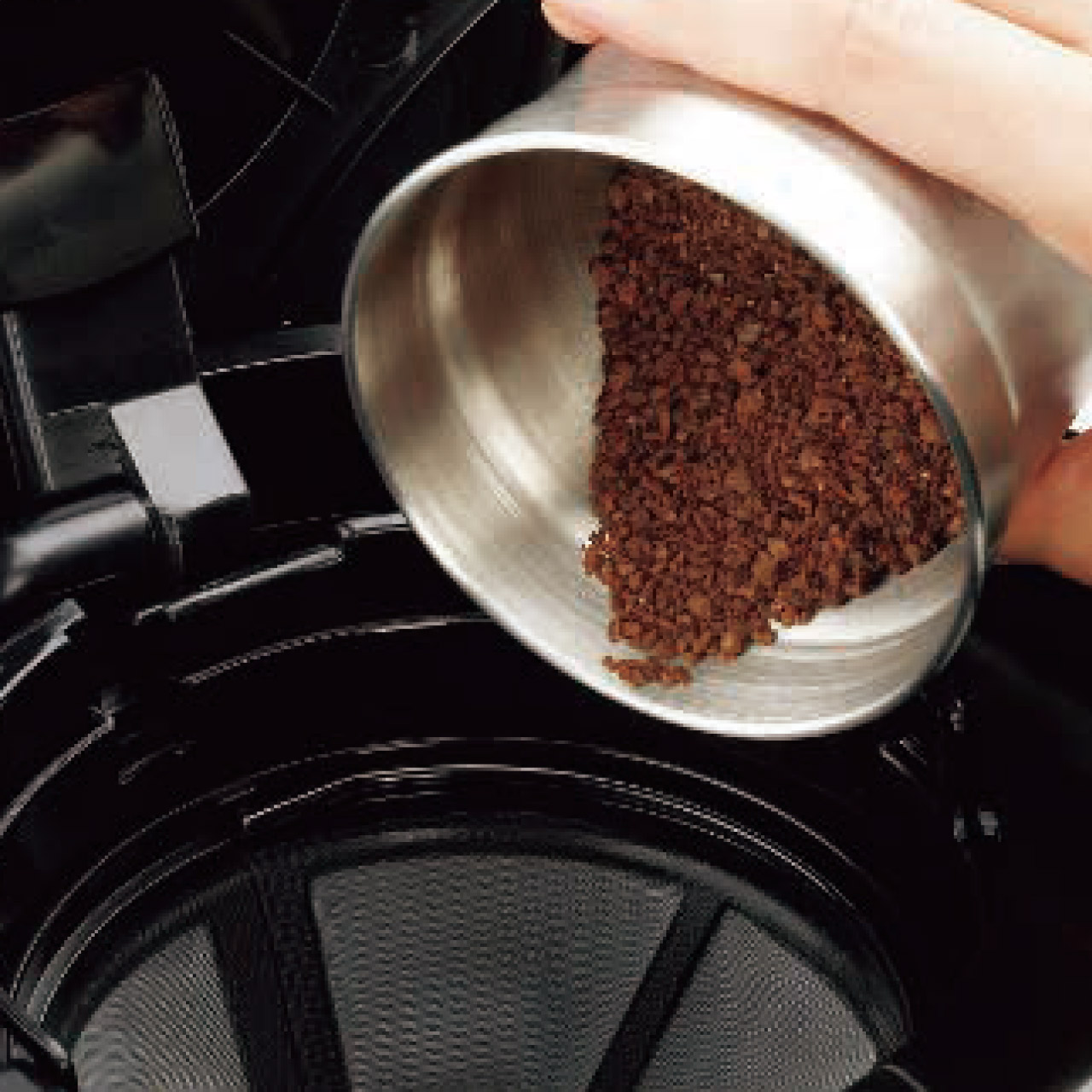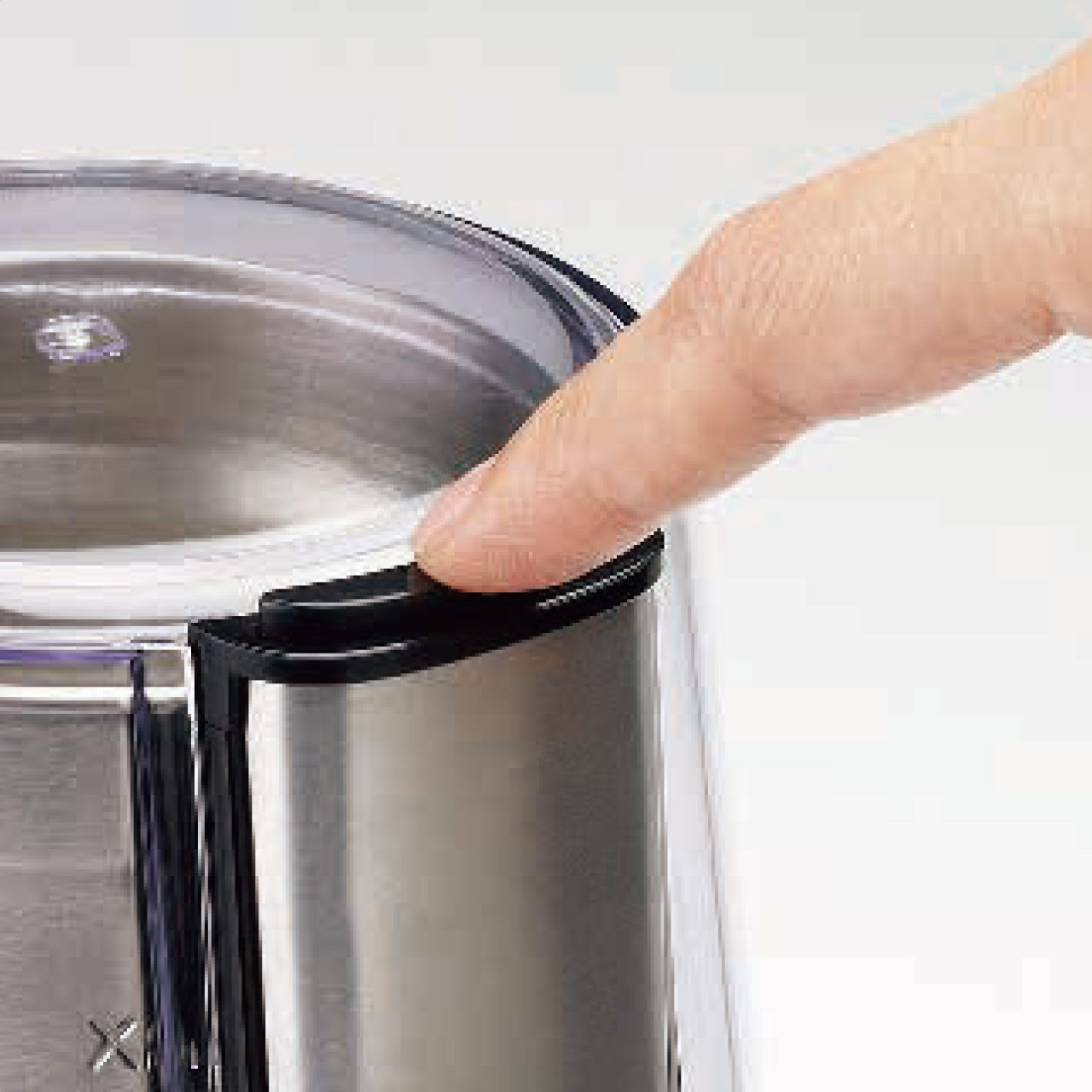 短時間操作で満足な仕上がり、粉をこぼさずフィルターへ。指一本でスイッチを押すだけの簡単操作。断続的に押して好みの挽き加減にしていきます。グラインディングボウルを取り外して挽いた粉をフィルターに移せます。掃除用ブラシ付属。
