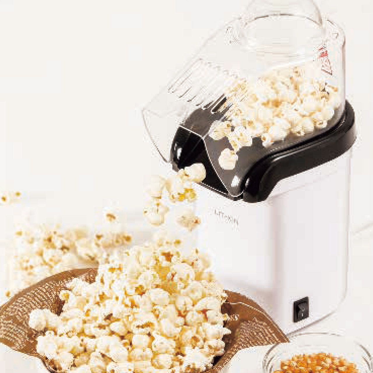 ■自宅で簡単!弾けるポップコーン作りメジャーカップにコーン(ポップコーン用)を入れ、スイッチオン!1回で約60gのポップコーンが簡単に作れます。油を使わないからヘルシー。■軽量・コンパクト設計約11.5cm×17.5cm×26.5cmのコンパクト設計。卓上でも場所を取りません。■アレンジレシピ付き色々なフレーバーが楽しめるアレンジレシピ付きです。できあがったポップコーンに味付けをしたり、溶かしたキャラメルやチョコをよく混ぜれば、色々な味が楽しめます。■日本ポップコーン協会公認日本で、世界で唯一のポップコーンの協会「日本ポップコーン協会」公認!本製品を使用して考案した公式レシピをWEBで公開しています。■お手入れ簡単本体とメジャーカップ、カバーは簡単に取り外せます。本体は乾いた布で、さっと拭くだけ。お手入れ簡単です。メジャーカップ、カバーは水洗いできます。