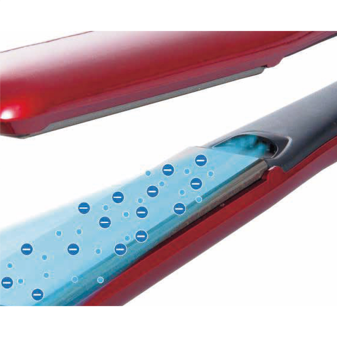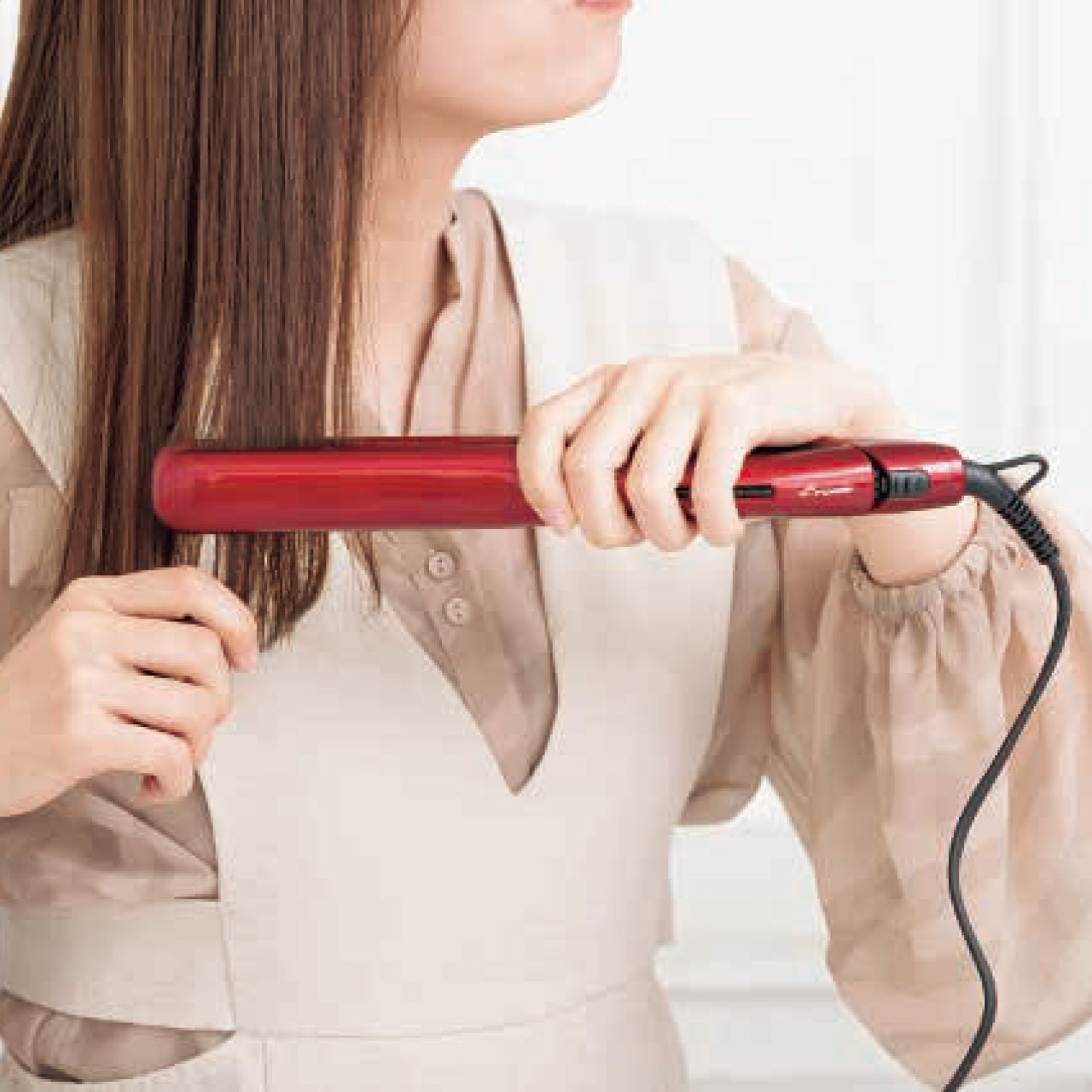 プレートの長さは11cmのロングプレート。ホールド力の高いクッションプレート採用。髪の毛をしっかりホールドできる。チタンコーティングで髪の滑りも抜群。ツヤサラの仕上がりに。スイッチオンで約45秒で立ち上がります。ボタン2度押しで設定温度をロックでき、使用中にボタンに触れて設定が変わる心配はありません。最後のボタン操作から約30分後に自動で電源がOFFになる安全設計。万が一の場合も安心。マイナスイオンを送出。摩擦などで発生するプラスイオンを中和し、静電気を除去。まとまりのある髪に。海外でも使用可能。
