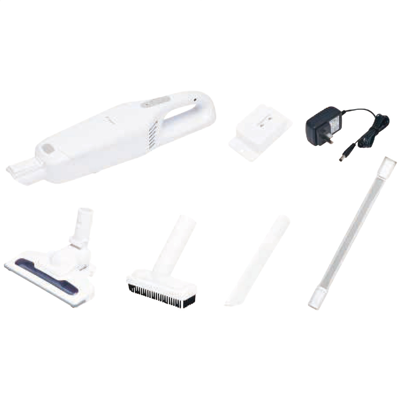 ■商品詳細 10×47×10.5cm・ABS樹脂・消費電力:20W・コード長:約1.8m・フロアブラシ、延長管、すき間ノズル、ブラシ付ノズル、充電用ACアダプター、壁掛けホルダー、紙パック(20枚入)付・[中国製]