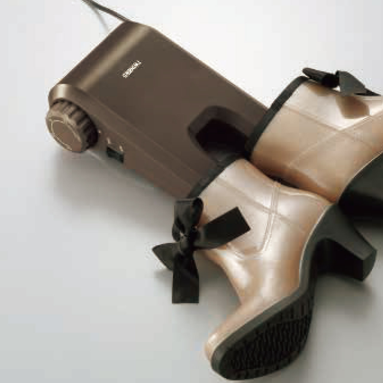 長靴から革靴、運動靴まで家族みんなのくつ乾燥機。コンパクトでかわいいフォルム。折りたためるスタンド付で、すっきり収納。最大120分タイマーで消し忘れを防止。ボタン1つで標準・革靴モード切替可能。
