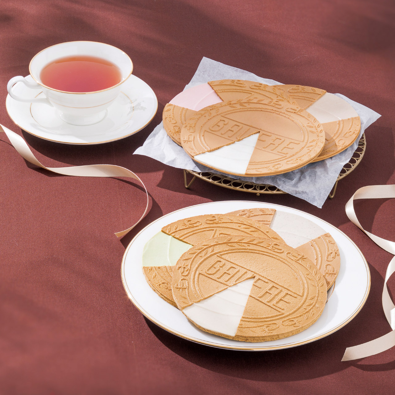 薄く焼き上げた洋風せんべいにバニラ、ストロベリー風味、チョコの3種類のクリームサンドし、伝統に支えられた美味しさです。