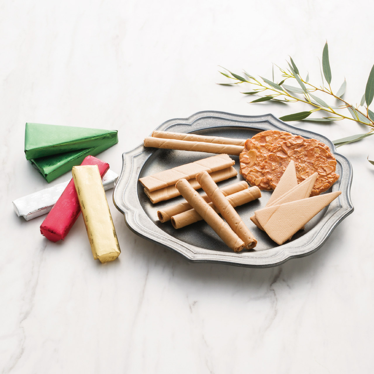 フランス語で木の皮を意味する「エコルス」から着想したネーミングの焼菓子エコルセは、シンプルな美味しさの三角と短冊、ミルクチョコレート・ホワイトチョコレートを包んだ丸型の計4種。1970年の発売以来かわらない、シンプルで飽きのこない上品な味わいです。