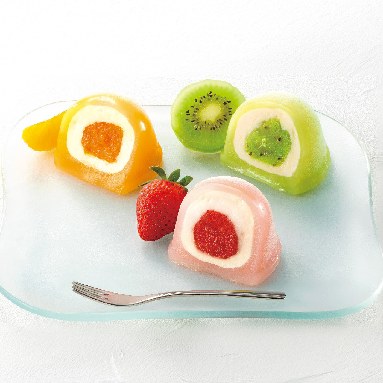 厳選したフルーツとコクのあるクリームを、もちもちのお餅で包み込んだ、甘酸っぱく、クリーミーな味わい。●いちご・・・いちご果肉入りソース、クリーム、もちもちのお餅が合わさる華やかな味わい。●みかん・・・みかん果肉入りソース、クリーム、もちもちのお餅が合わさる爽やかな味わい。●キウイ・・・キウイ果肉入りソース、クリーム、もちもちのお餅が合わさるフルーティーな味わい。