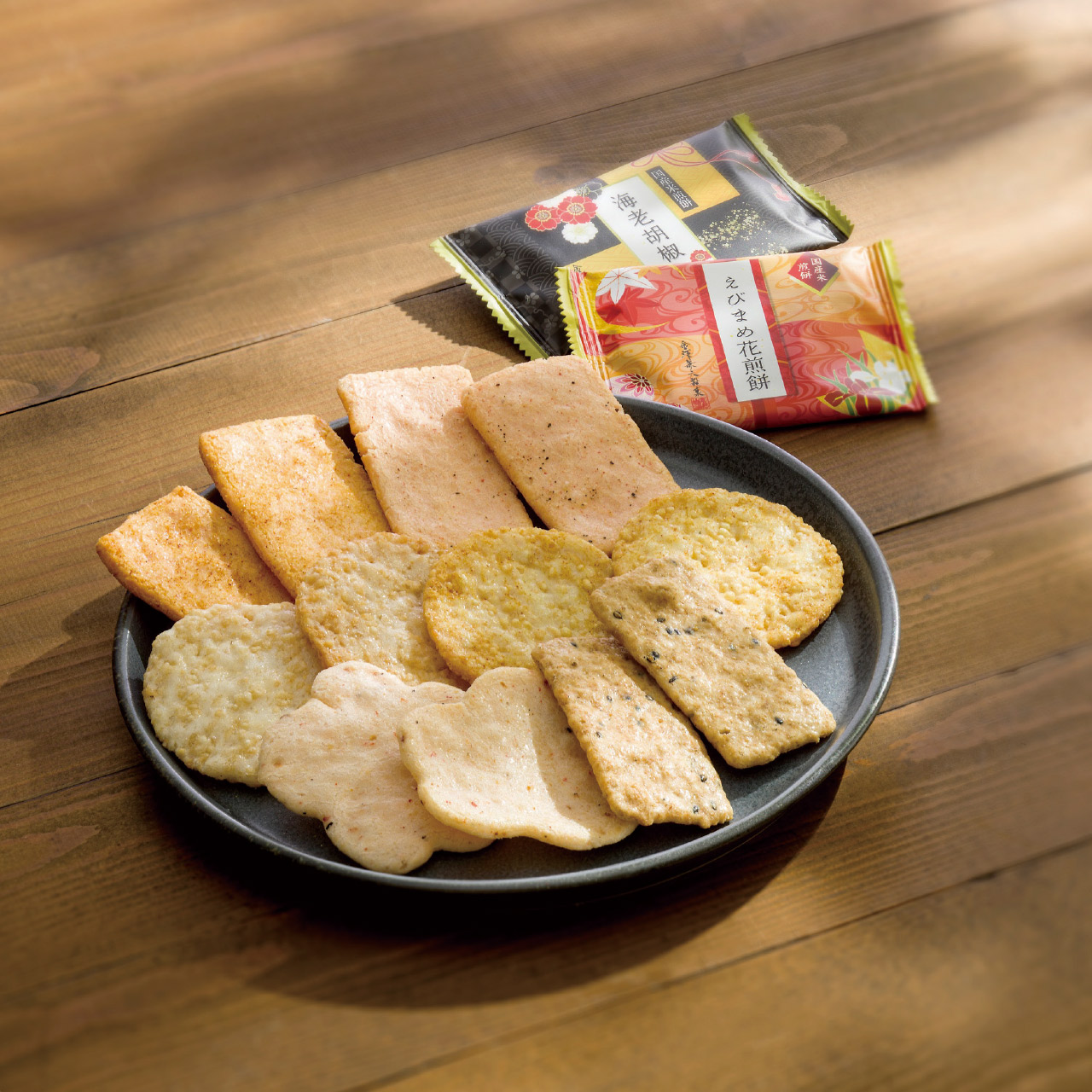 ■商品詳細 えびまめ花煎餅・金澤カレー煎餅・海老胡椒煎餅各8枚・海老カレー煎餅・黒ごま入り玄米煎餅各5枚・つぶやきサラダ煎餅4枚・賞味期間/製造日より常温約120日・[日本製]・【乳成分・えび・ごま・大豆・豚肉】