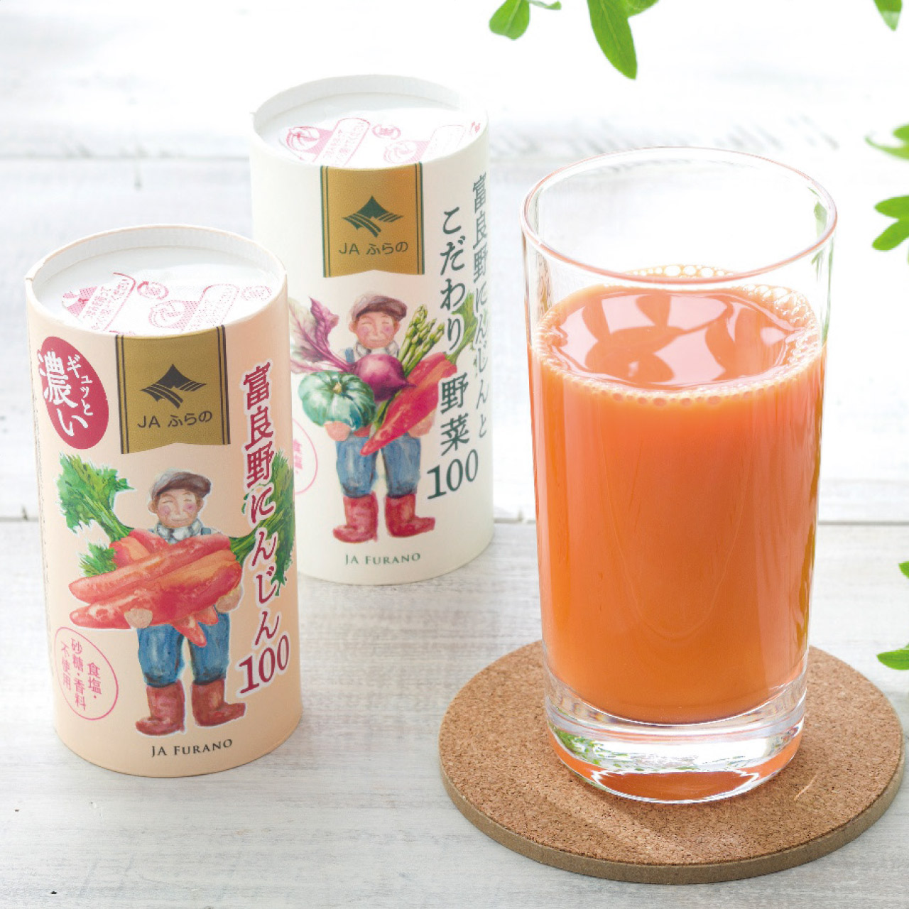 甘さとコクが自慢の富良野にんじんを搾ったにんじんジュースと、北海道産かぼちゃ、ビーツ、国産アスパラガスを加えたにんじんミックスジュースの詰合せ。人参、野菜のエグ味がなく、フルーティーな味わいのジュースです。