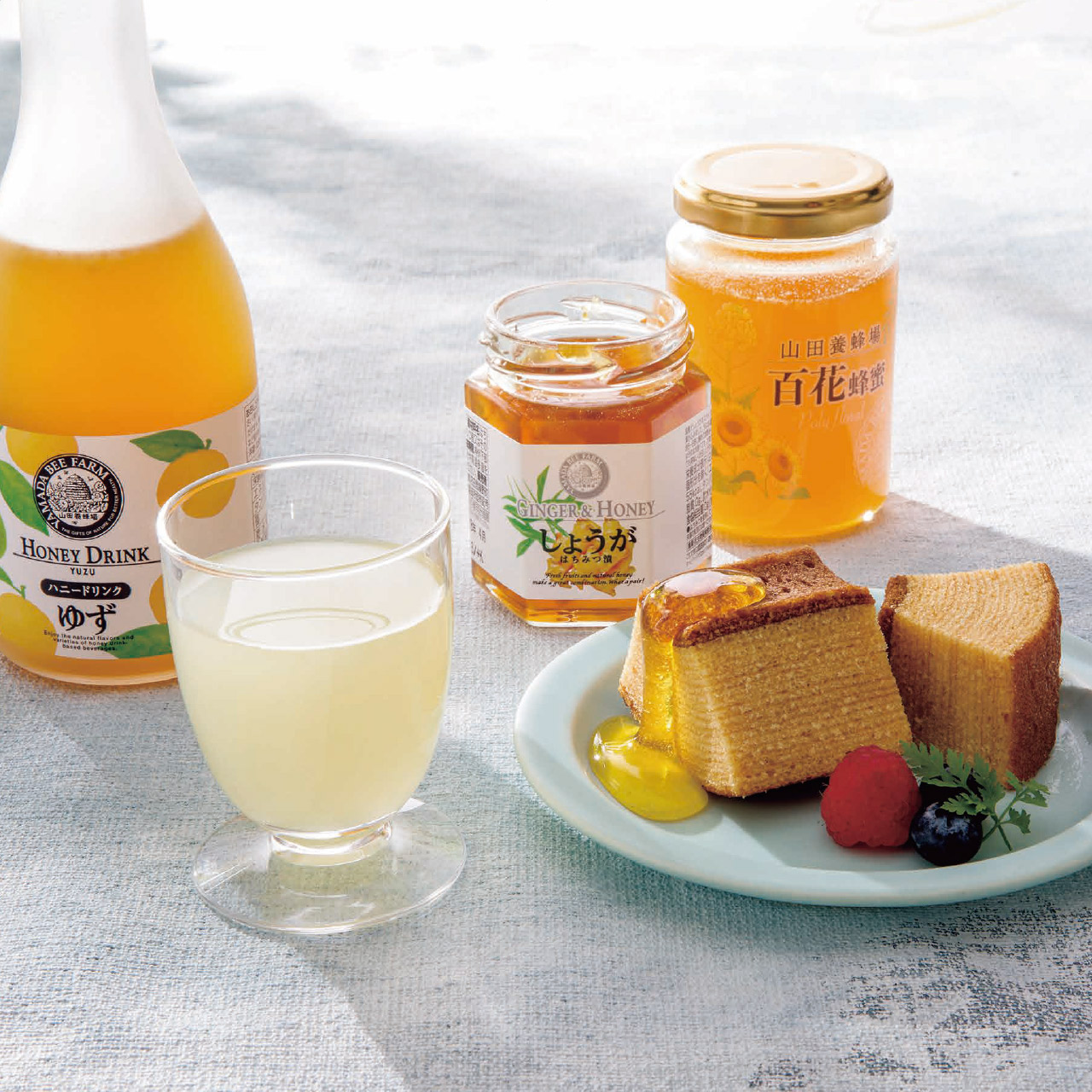 はちみつを加えしっとり焼き上げたバウムクーヘンと濃厚な甘みの百花蜂蜜、ゆずハニードリンク、しょうがはちみつ漬をセットにした食卓を彩るギフトです。