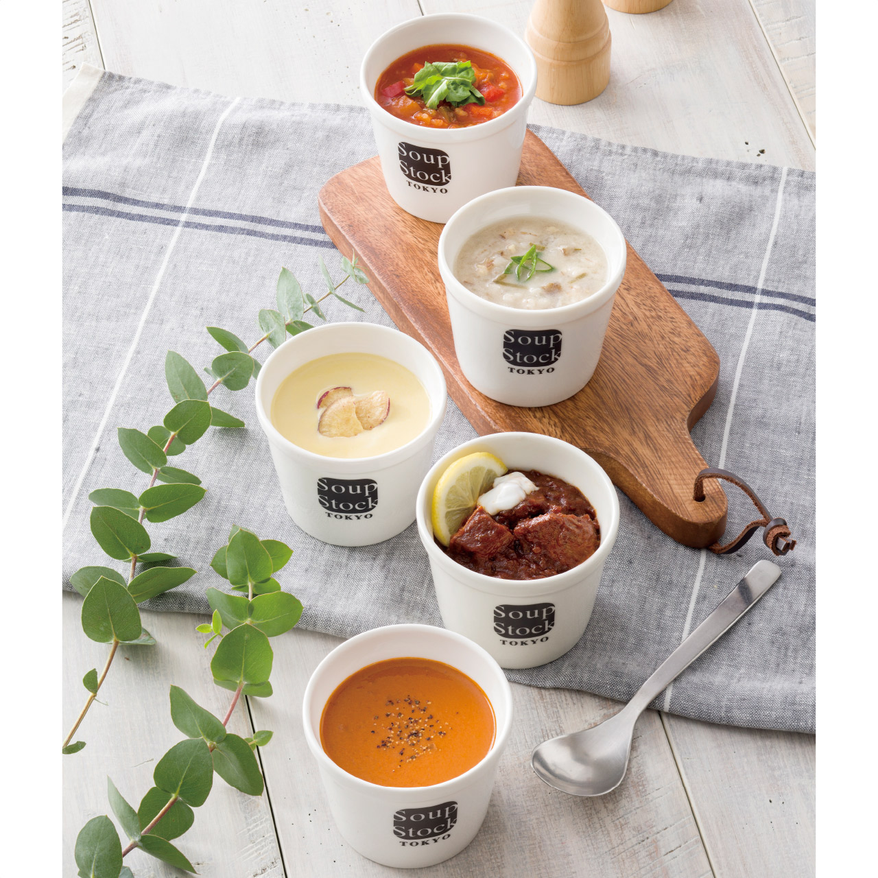 食べるスープの専門店“Soup Stock Tokyo”の人気のスープをお楽しみいただけるセットです。オマール海老の頭をじっくりソテーした「オマール海老のビスク」 や焼いた真鯛の頭を力強く煮だした「焼き鯛だしの和風スープ」、素材のやさしい甘さを引き出した「とうもろこしとさつま芋のスープ」など、バラエティ豊かなスープを詰合せました。電子レンジで簡単にお召し上がりいただけます。