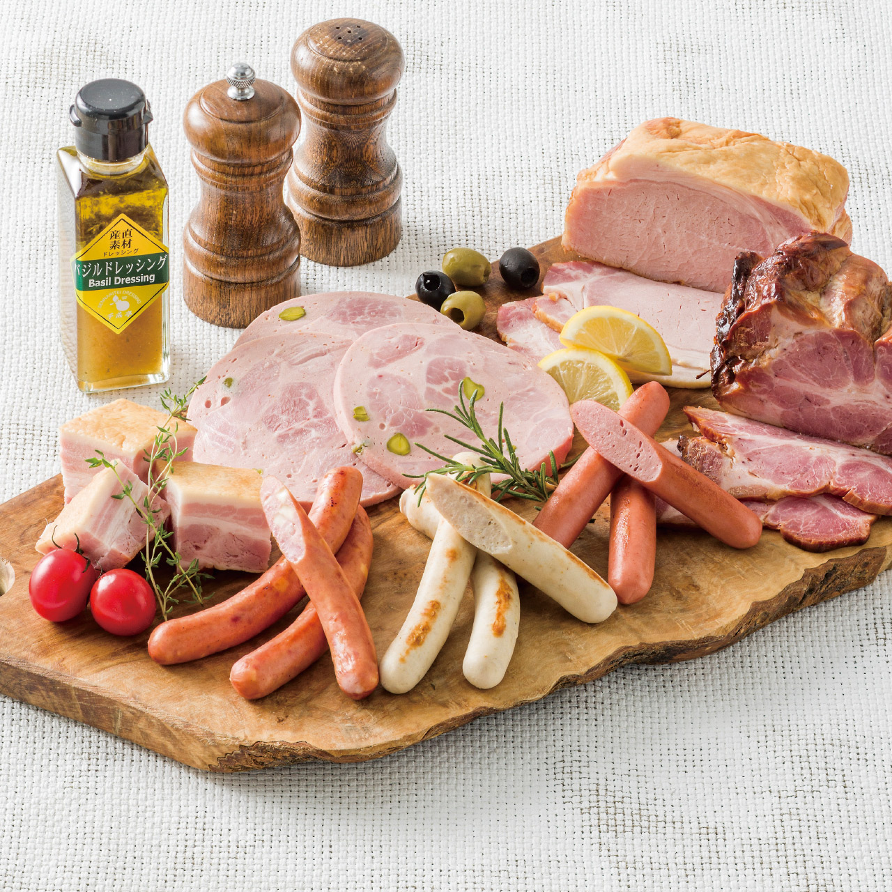 ■商品詳細 ロースハム300g・焼豚300g・ビアシンケン200g・ベーコン300g・オリジナルウインナー4本・ブラートブルスト4本・ケーゼグリラー4本・オリジナルドレッシング100ml×1本・賞味期間/冷蔵20日・賞味目安約18日・豚肉(国産)/[日本製]・【乳成分・小麦・牛肉・大豆・豚肉】