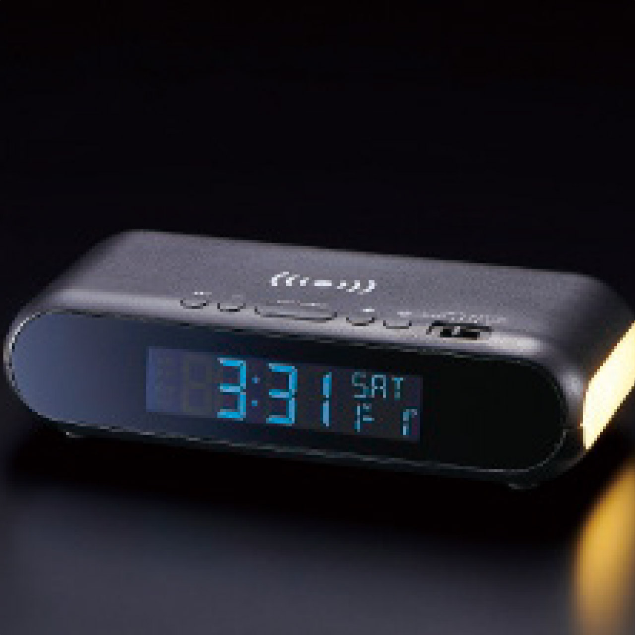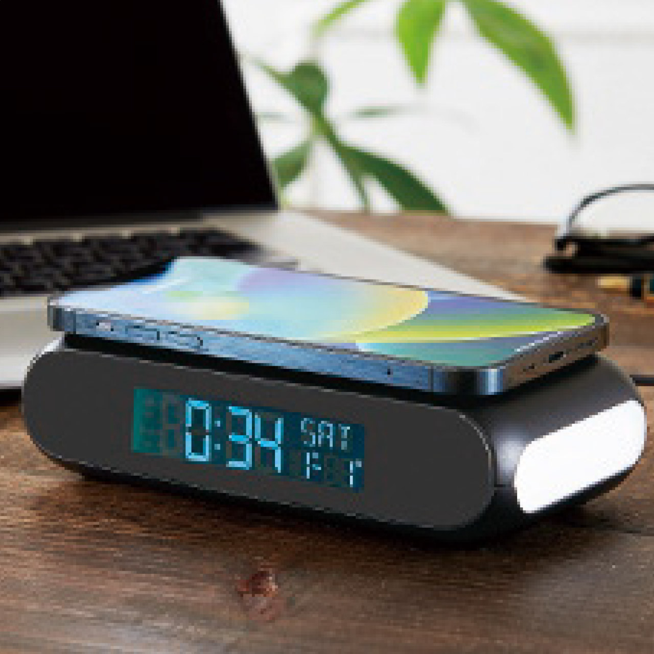 Qi対応のスマートフォンを置くだけで充電が出来るワイヤレス充電機能付の時計です。背面にUSBポートを備えておりワイヤレス充電非対応のスマートフォン等も充電可能。枕元にあると便利なナイトライト機能付。機能:ワイヤレス充電(最大15W)、バックライト、ナイトライト、時計、カレンダー、アラーム、スヌーズ、USBポート