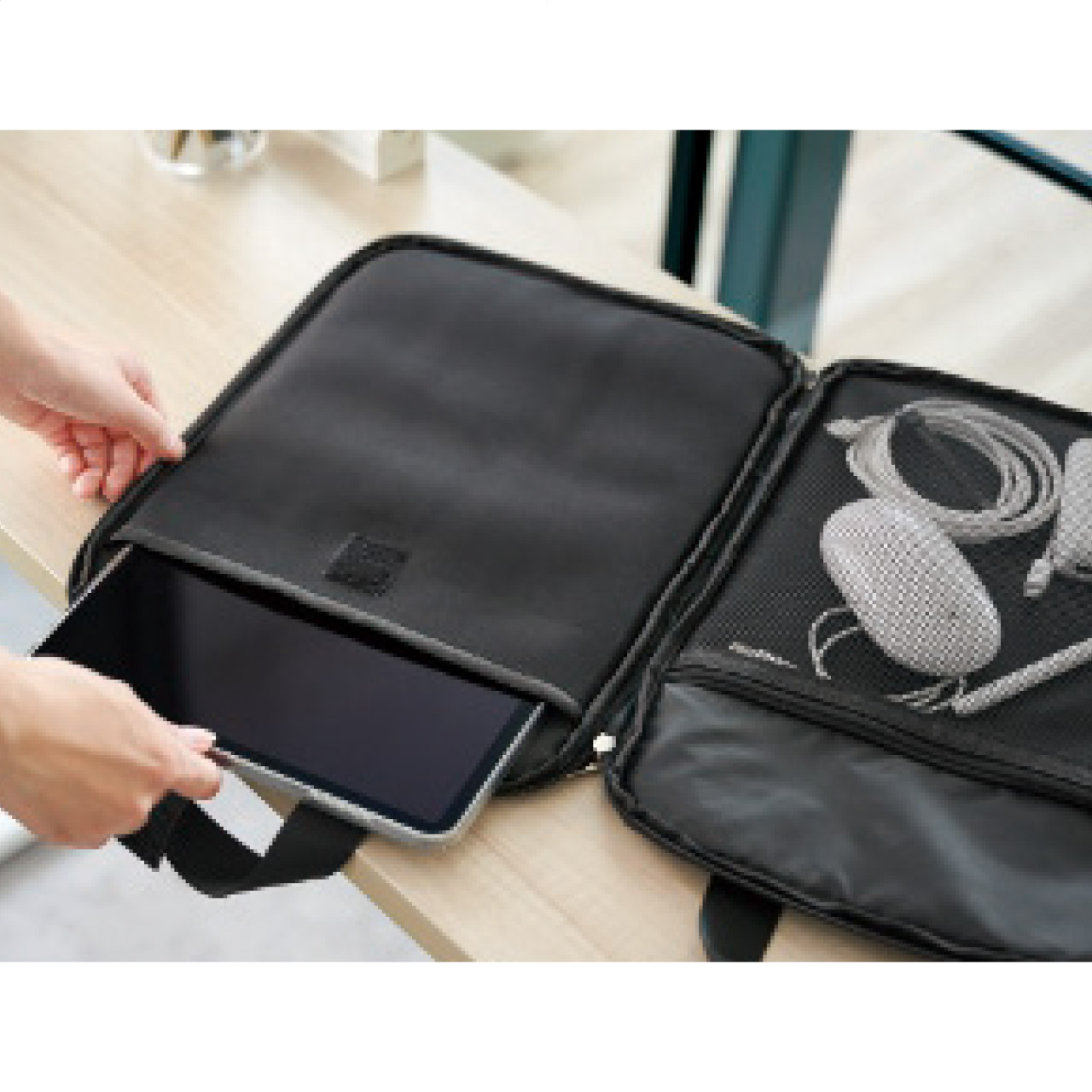 14インチノートパソコンに対応するPCバッグ。日常使いからビジネス利用まで幅広く活躍します。小物を収納できるポケット付。