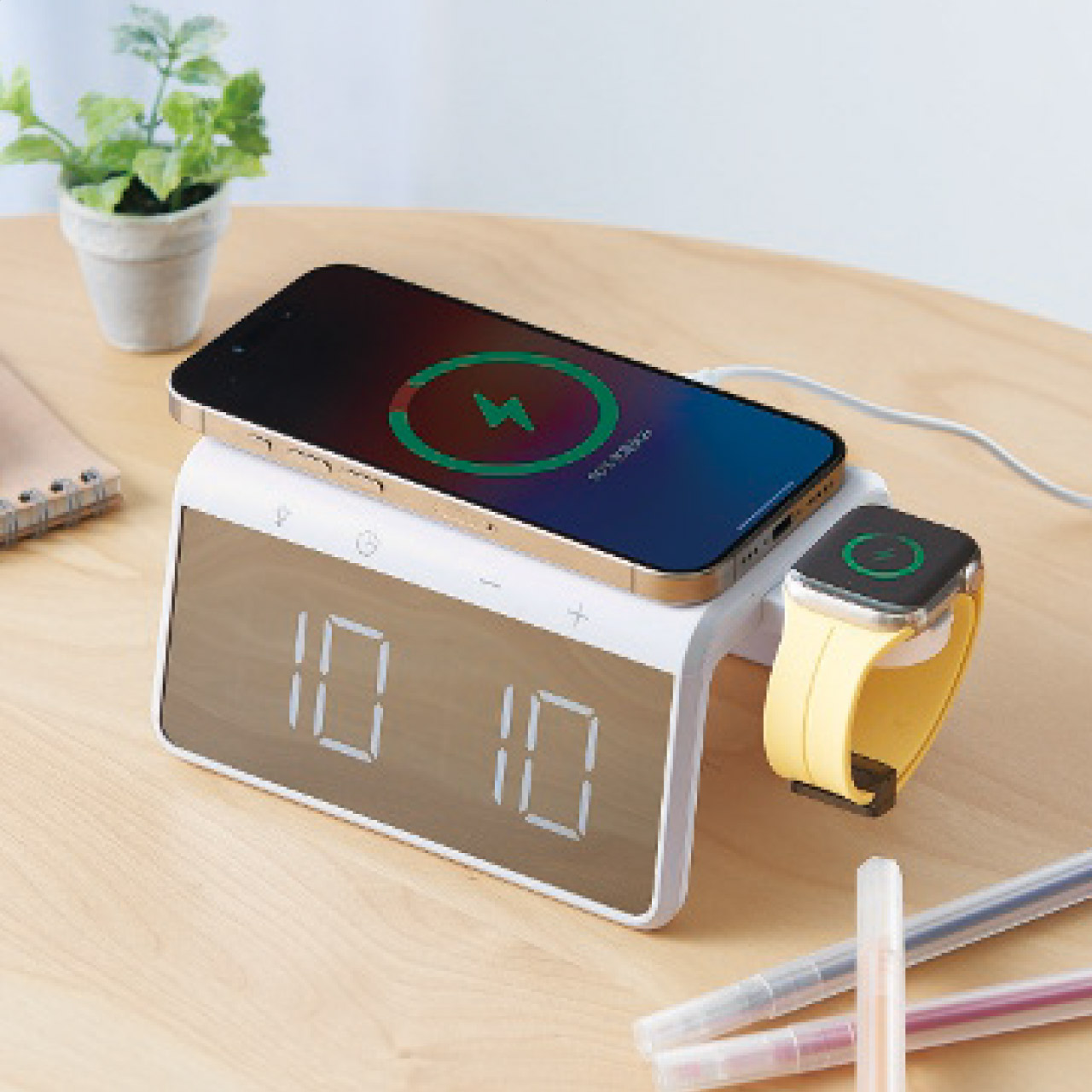 Qi対応のスマートフォンを置くだけで充電が出来るワイヤレス充電機能付の多機能時計です。スマートフォンに加え、アップルウォッチもワイヤレスで充電可能です。機能:ワイヤレス充電(最大15W)、時計、カラーディスプレイ、アップルウォッチのワイヤレス充電、USBポート×1