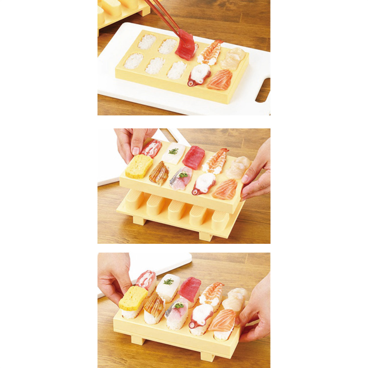 お寿司が飛び出す、すし下駄形のお寿司型。一度に10貫作れます。