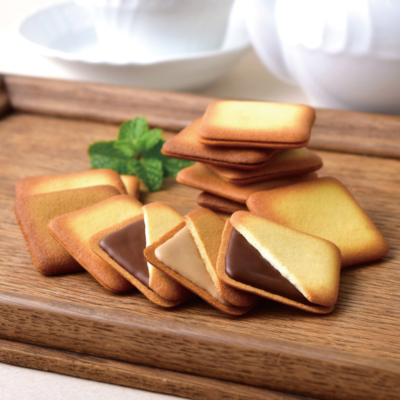 サクッとしたラングドシャクッキーでなめらかなチョコレートクリームをサンドしました。チョコレートクリームはスイート・ミルク・コーヒーの3種類。軽い口どけのクッキーとの優雅な出会いをお楽しみください。モンドセレクション3年連続金賞受賞(2010年~2012年)