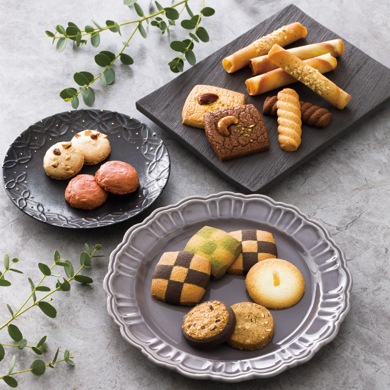 ゴンチャロフ ロングセラー商品のチョコレート入りロールクッキー・コルベイユをはじめ、マカロンやナッツを使ったクッキーなどバラエティーとボリューム感を追求したクッキーの詰合せです。