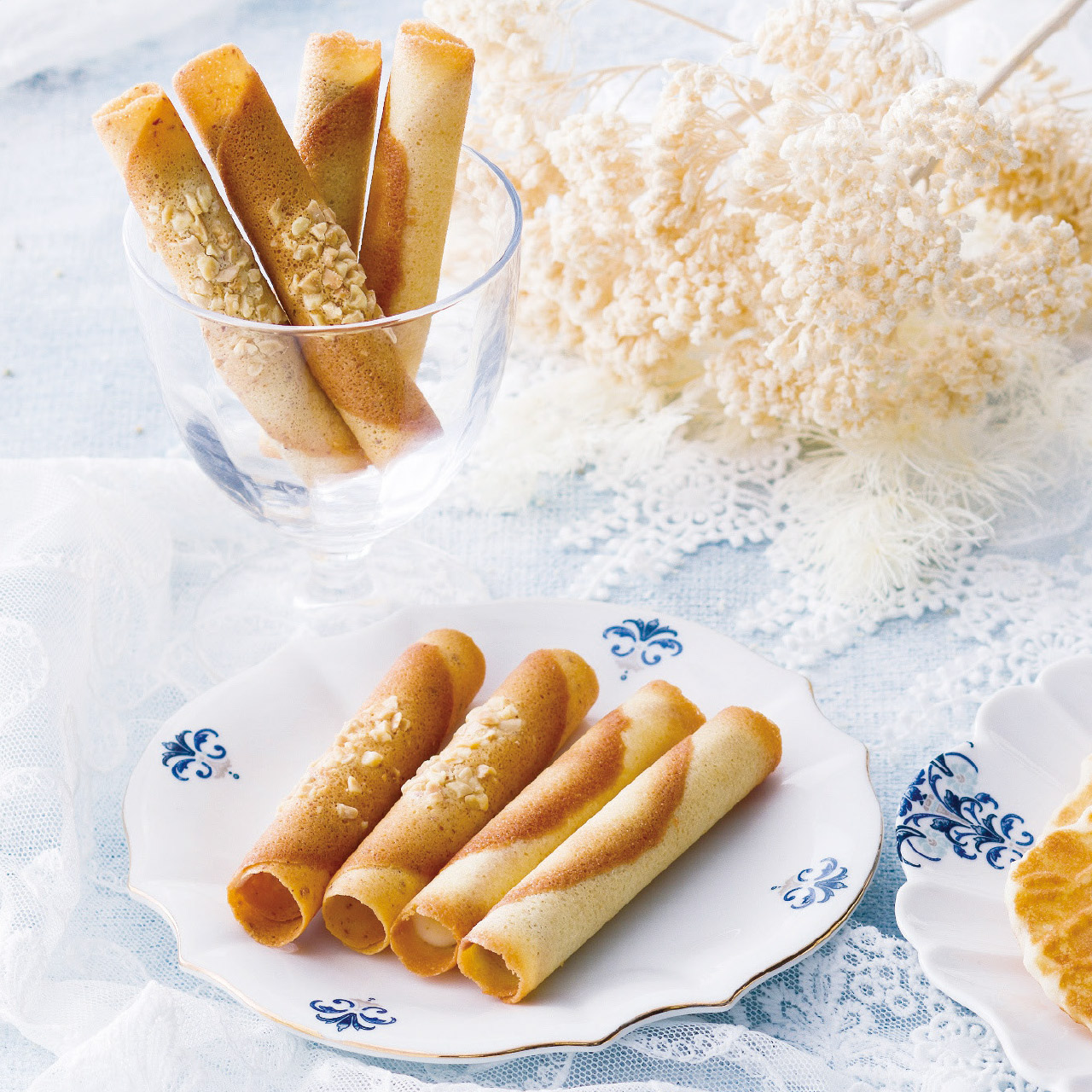 ~チョコレートをくるんだクッキー~アーモンド風味のチュイールと、バター風味のラングドシャ生地にアーモンドミルクチョコレートとホワイトチョコレートを流し込みました。