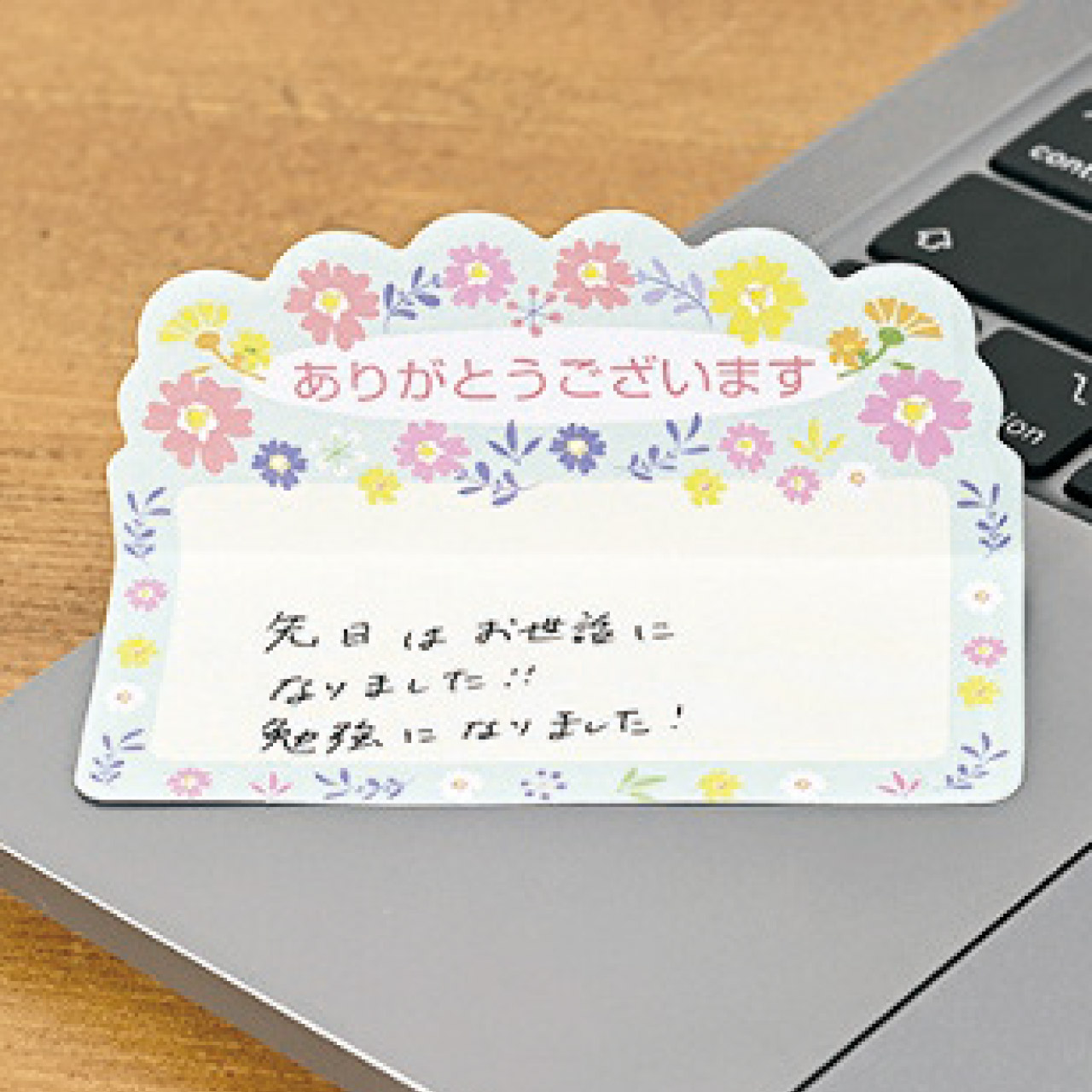 「ありがとうございます」の言葉を添えた、貼ったり、立てたり、挟んだり、いろいろと使えるメモふせんです。