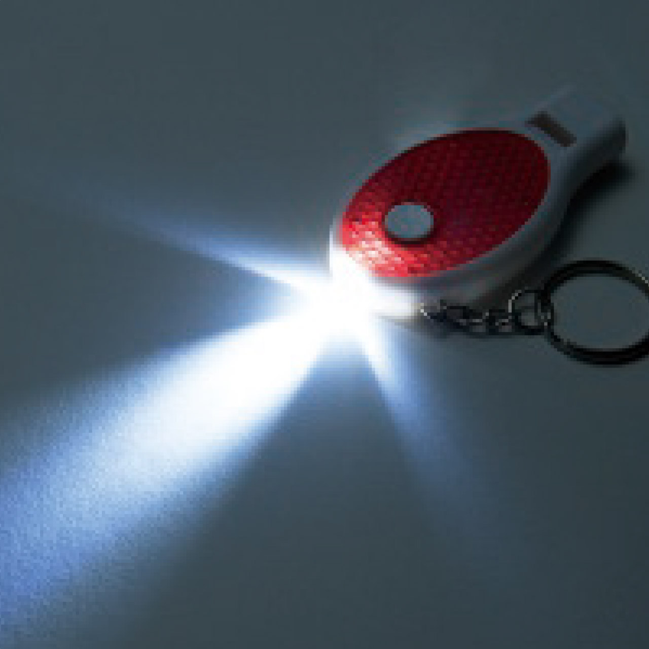 反射板機能が付いたライト付ホイッスルキーホルダーです。