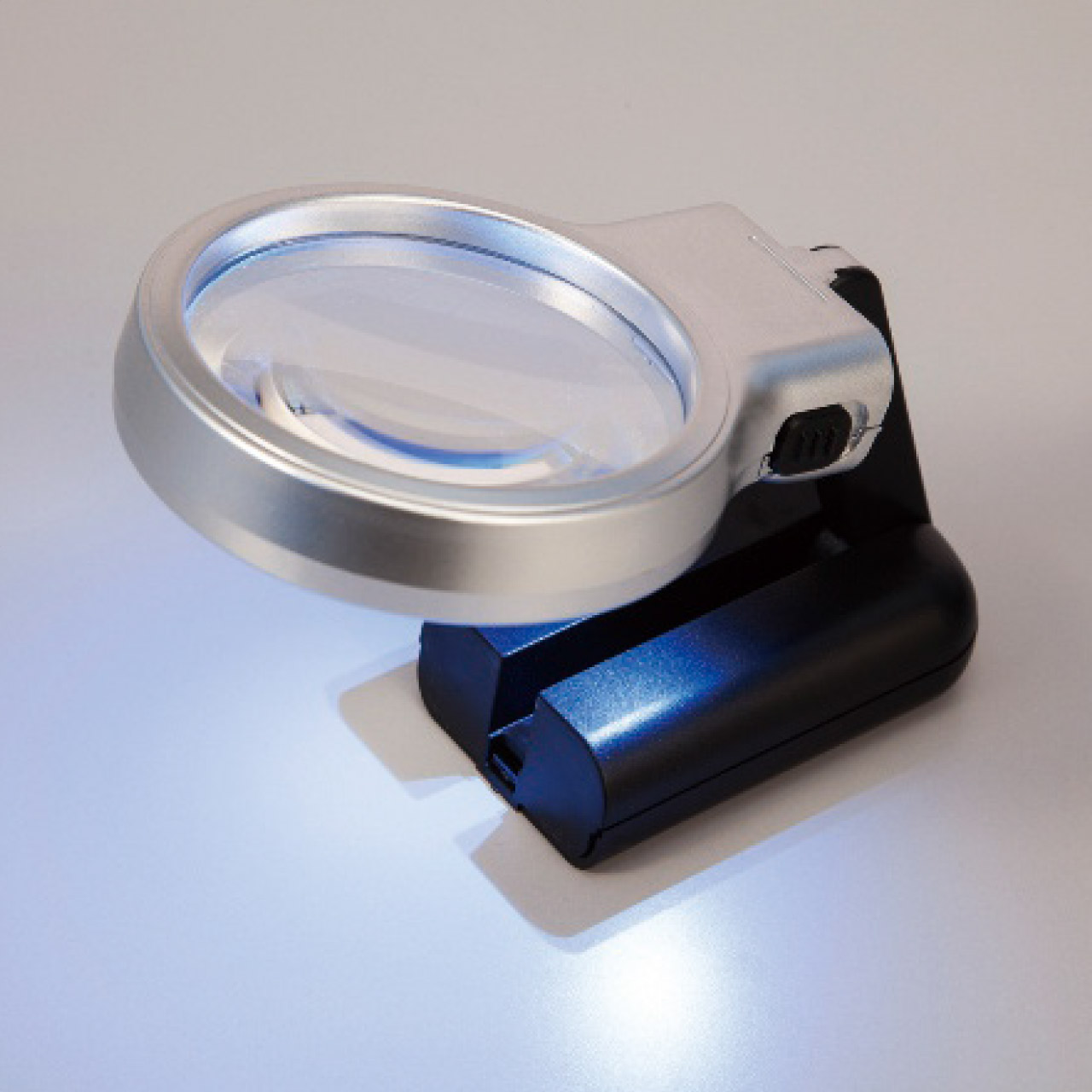 倍率3倍×直径65mmのアクリルレンズ。両手をフリーにするスタンド式。LEDライト付きで、手元を明るく作業効率がアップします。