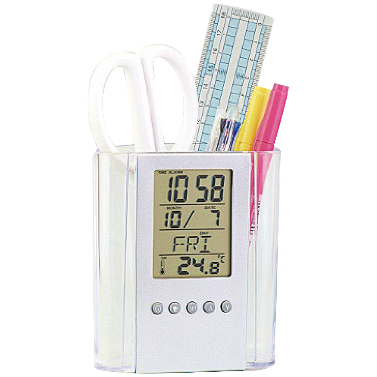 クリアカラーのペンスタンドクロックです。・時計・100年カレンダー・スヌーズ付アラーム・タイマー・温度表示