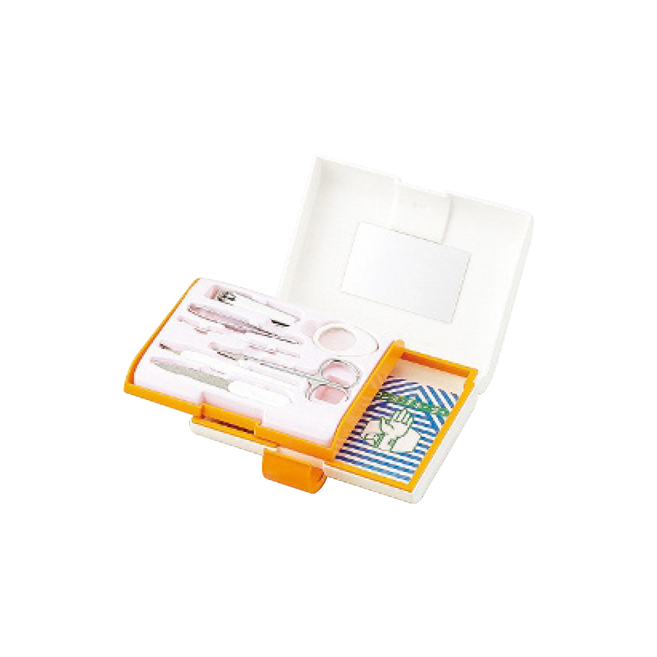 ■商品詳細 14.2×11.5×4.2cm専用ケース(鏡付)1個・HIPS樹脂・爪切り・エチケットハサミ・耳かき・毛抜き兼ピンセット・爪ヤスリ・キューティクルカッター・ルーペ・ワンタッチ包帯各1個・キズテープ(M)・コットンパフ各3枚・カラー綿棒10本・名入れ方法/ケース表面:シルクスクリーン・[日本・タイ・中国製]