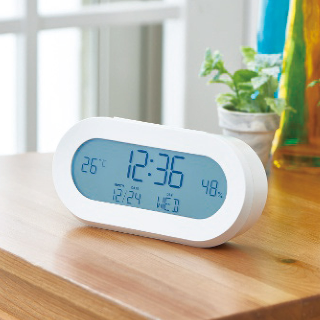 飾る場所を選ばないおしゃれな多機能マルチクロック。時計、アラーム、スヌーズ、カレンダー、温度計、湿度計、バックライトの充実の機能付。